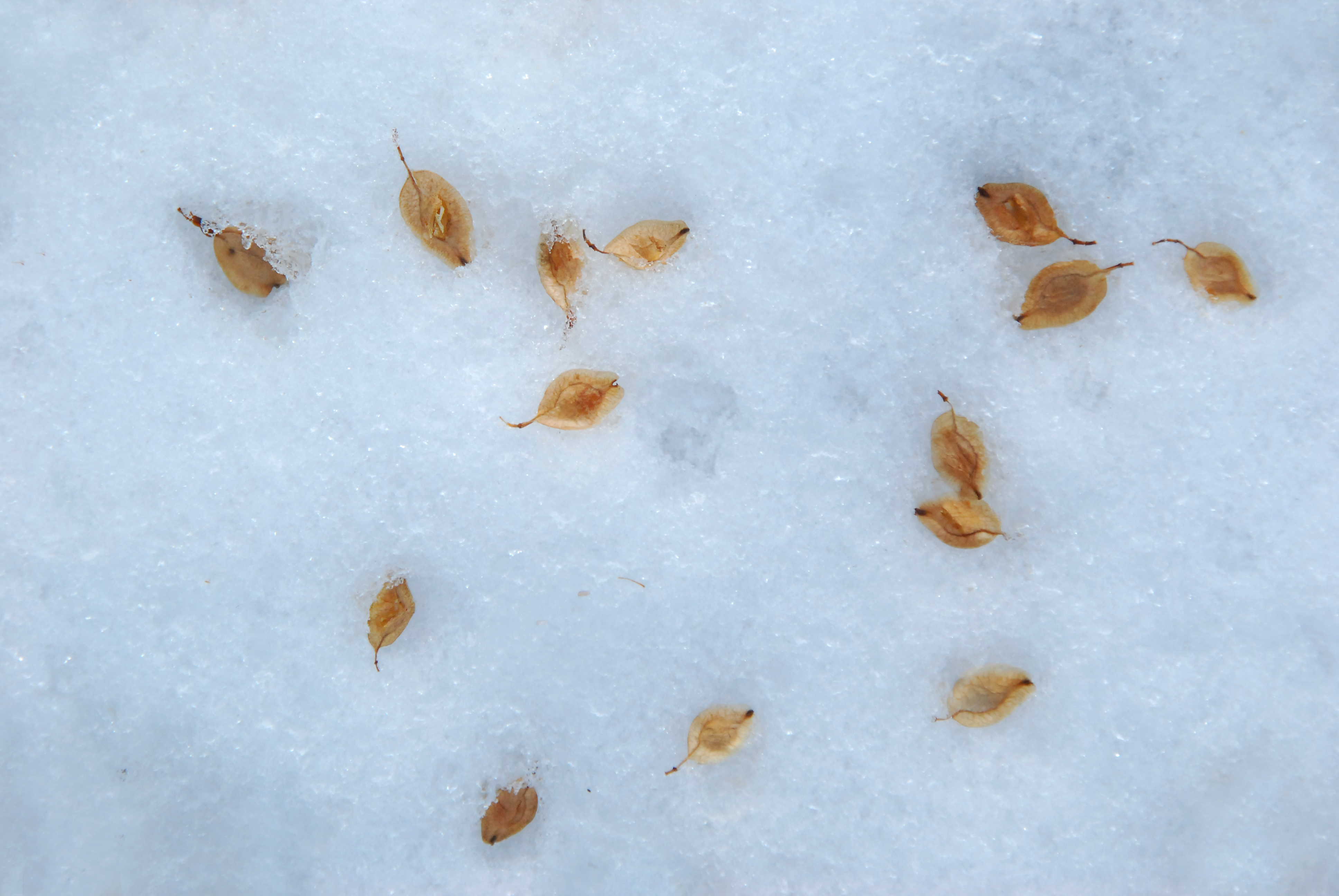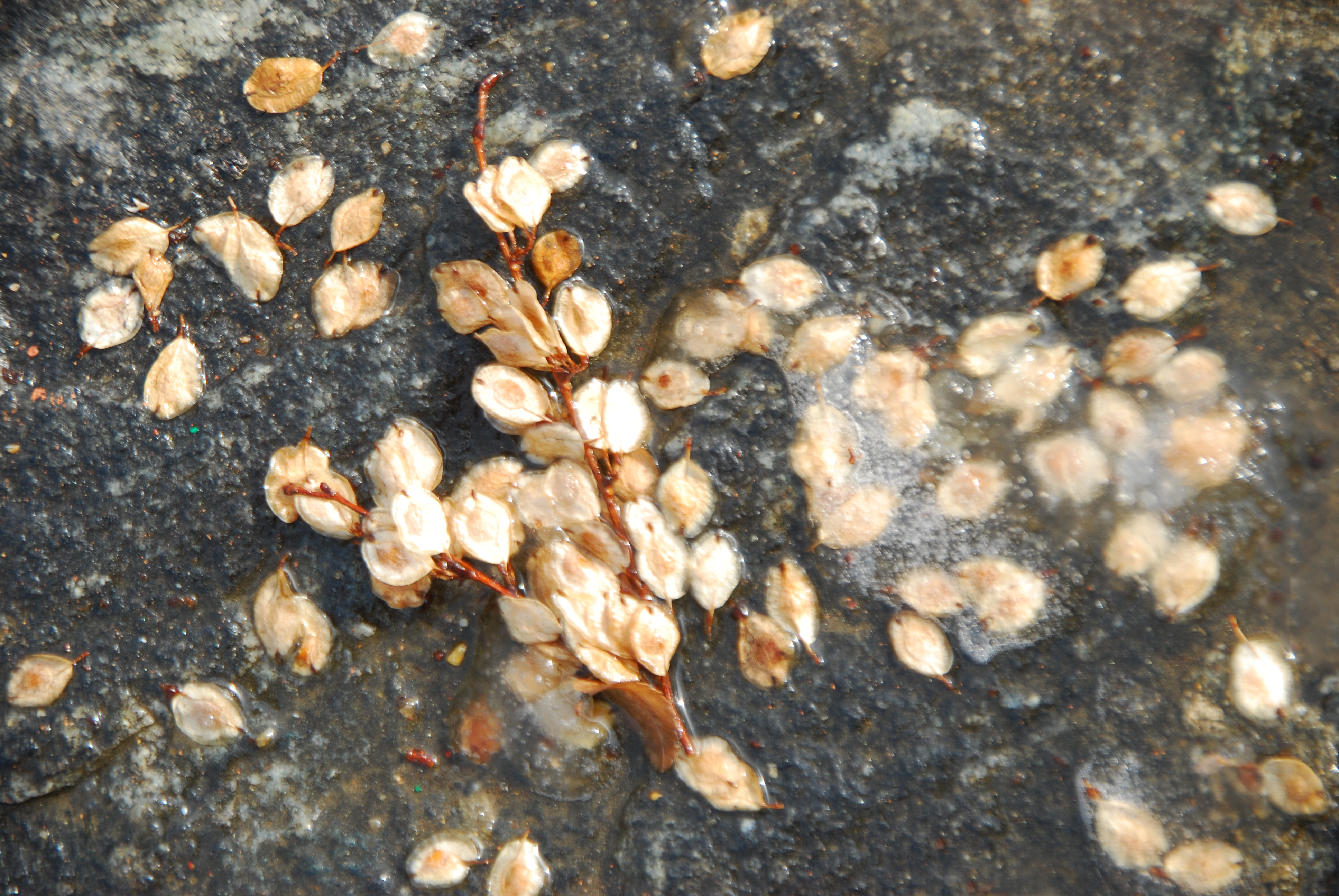 땅에 떨어진 가지는 쌓인 눈이 녹으면서
