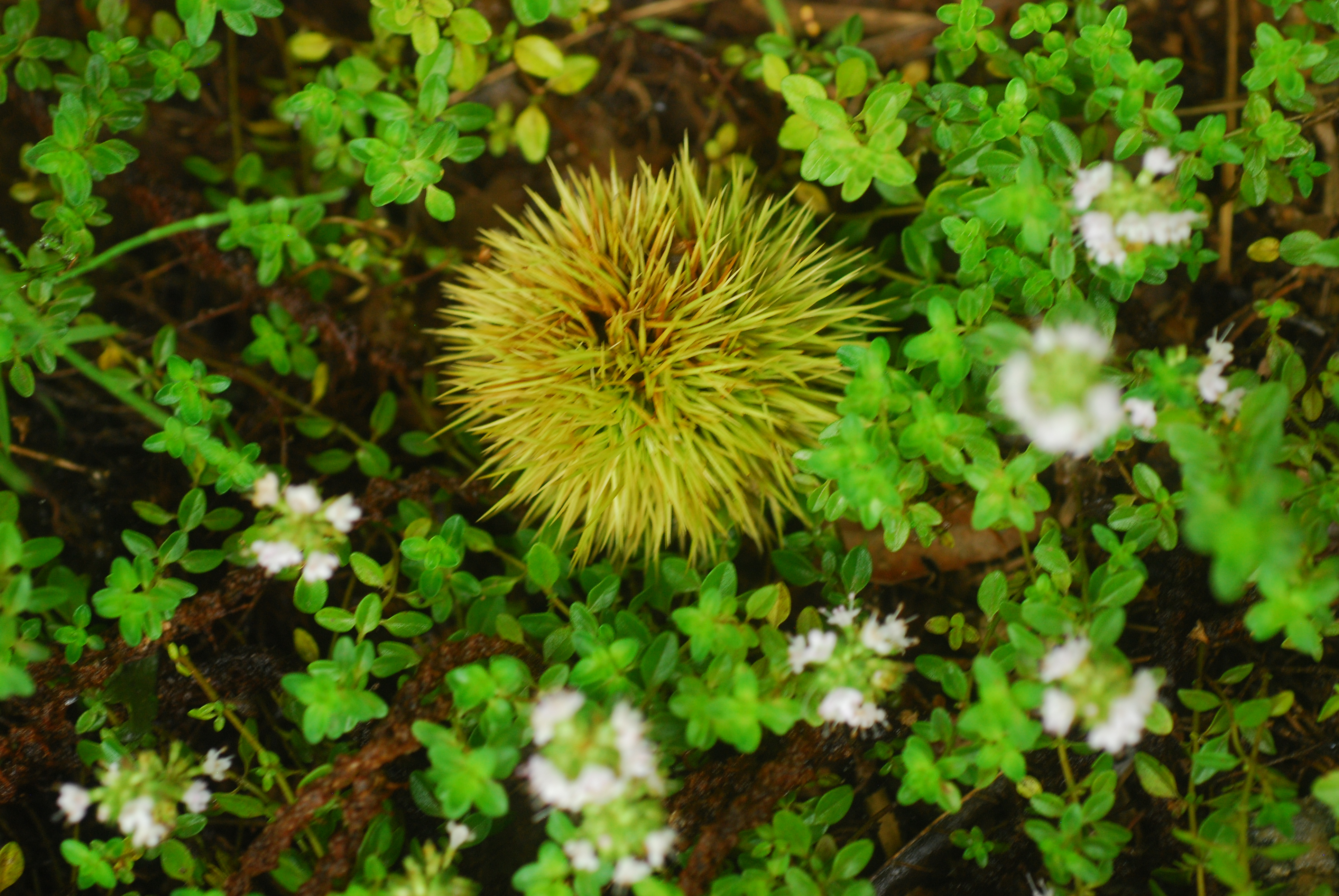 가시칠엽수 잎과 열매로 밤을 닮은 모습이다.