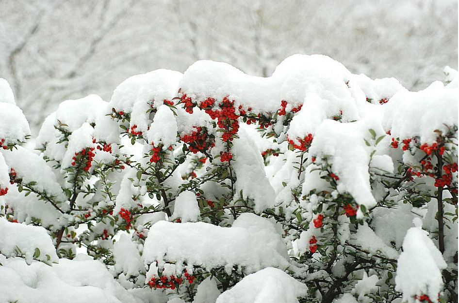 한겨울에 흰 눈 뒤집어쓰고 있는 피라칸타