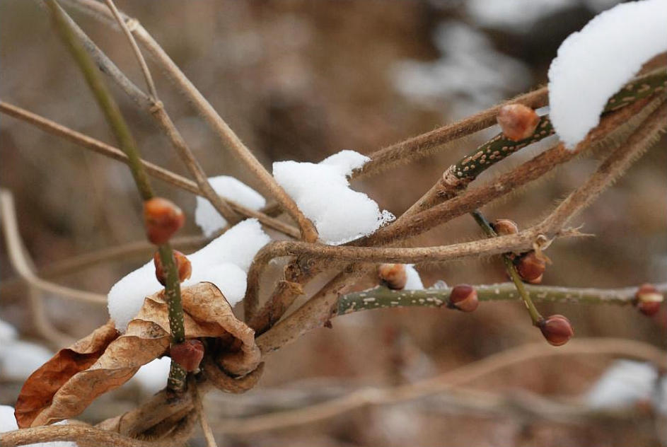 눈 쌓인 중에 생강나무 꽃눈 모습이다.