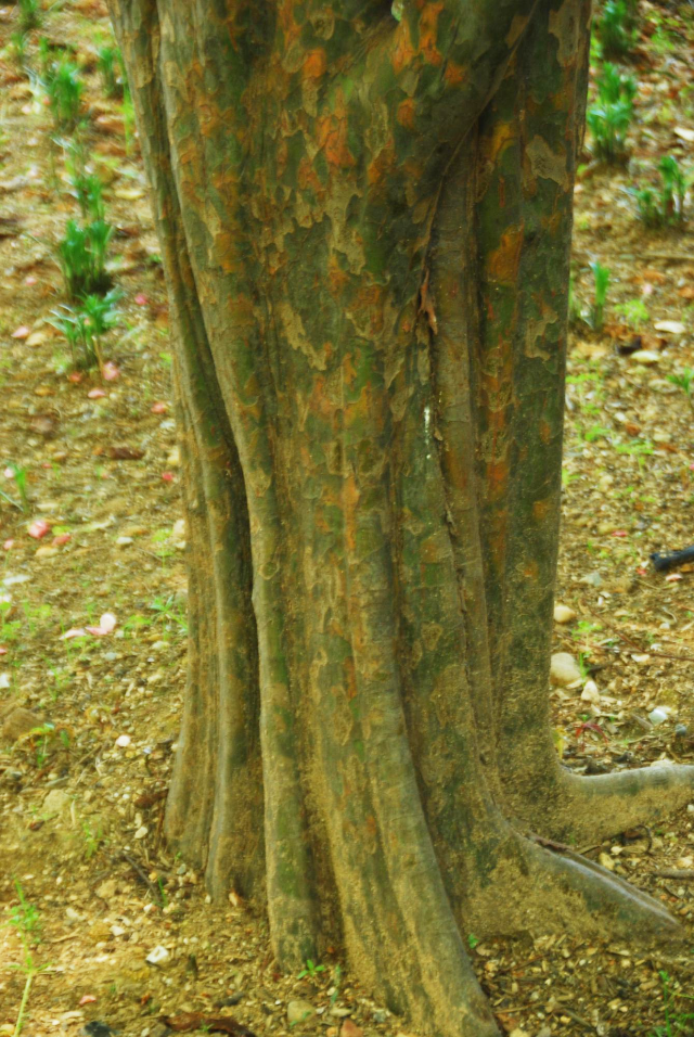 묵은 나무껍질이 벗겨져 얼룩무늬를 남긴다.