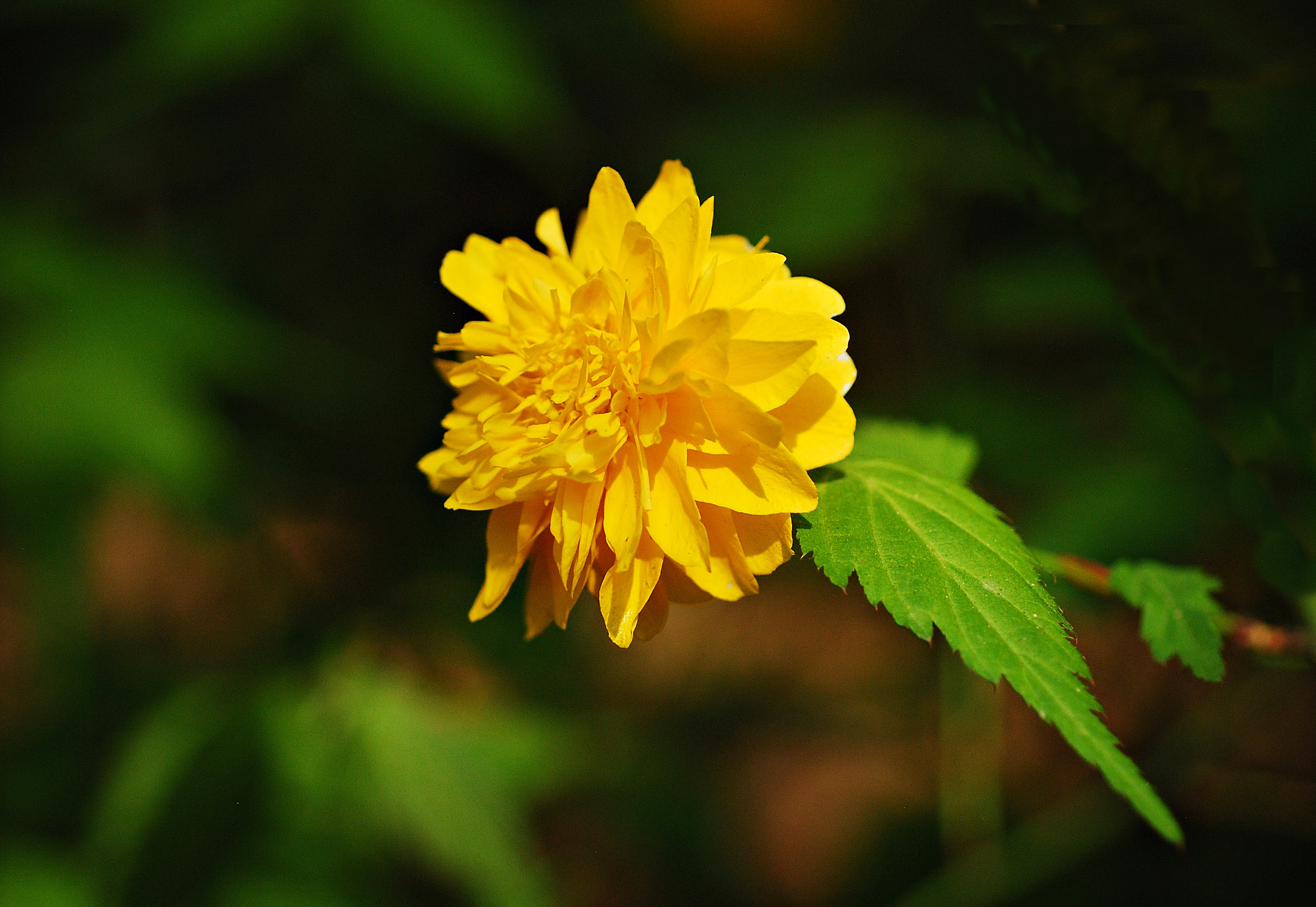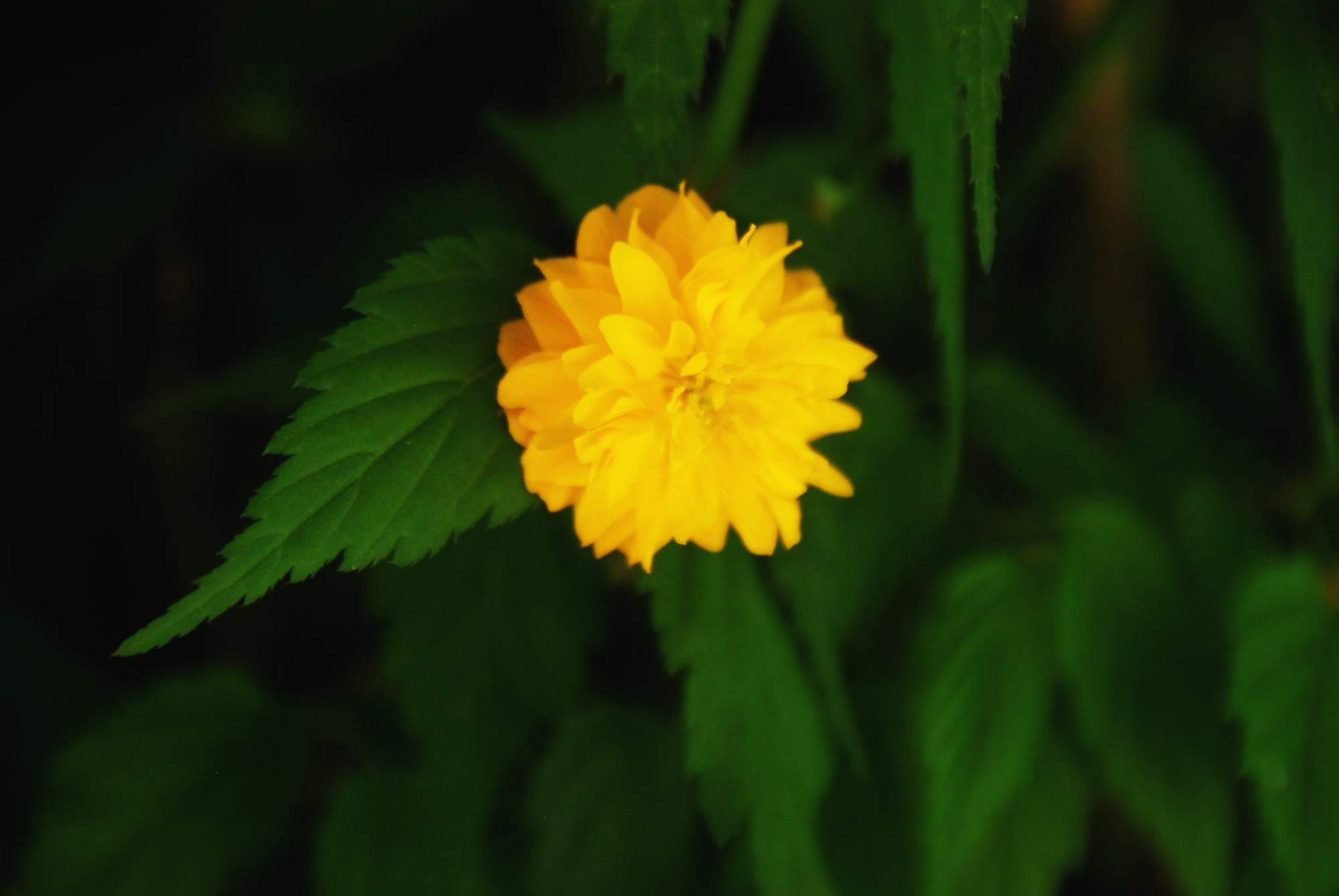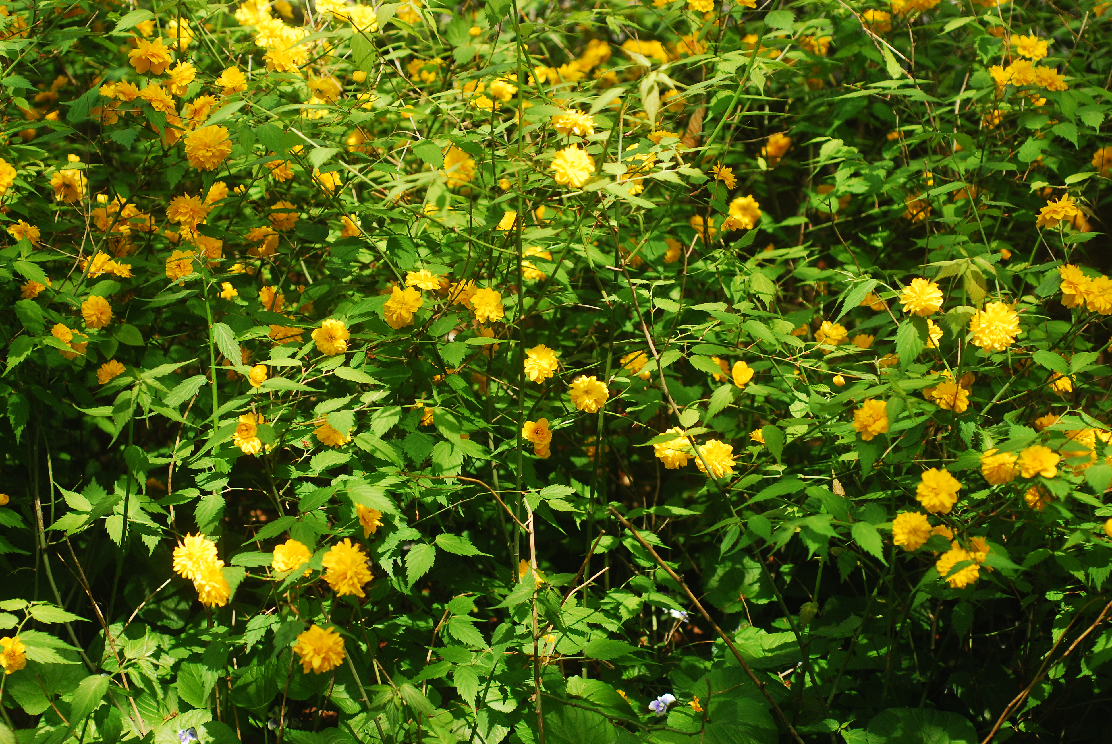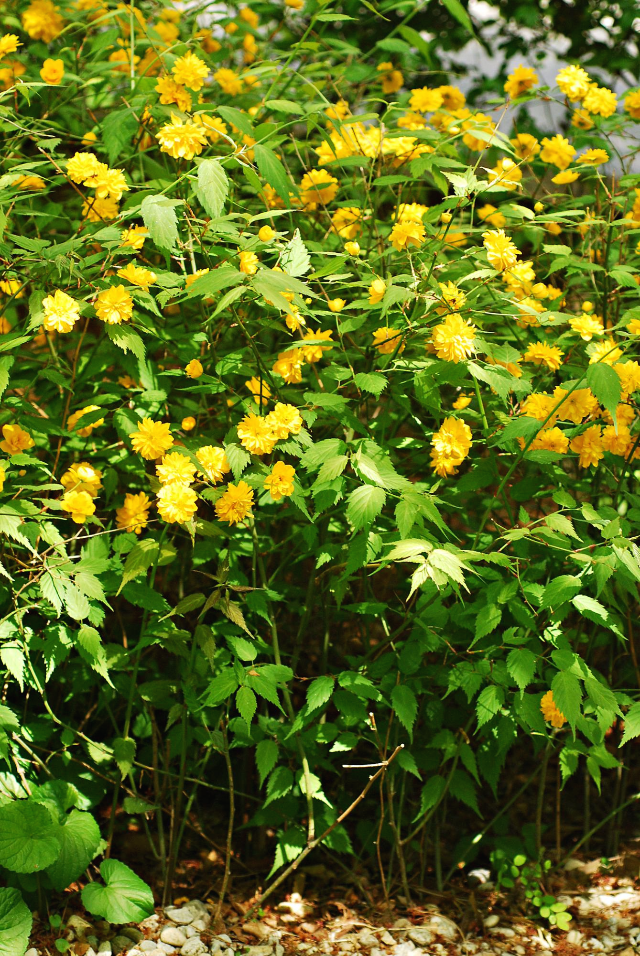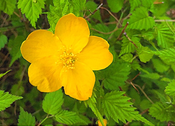 겹꽃이 아닌 황매화인데 가지 끝에 잎과 같이 핀다. 개화 기간이