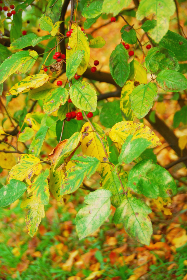 4월의 아그배나무 붉은색으로 익은 열매에