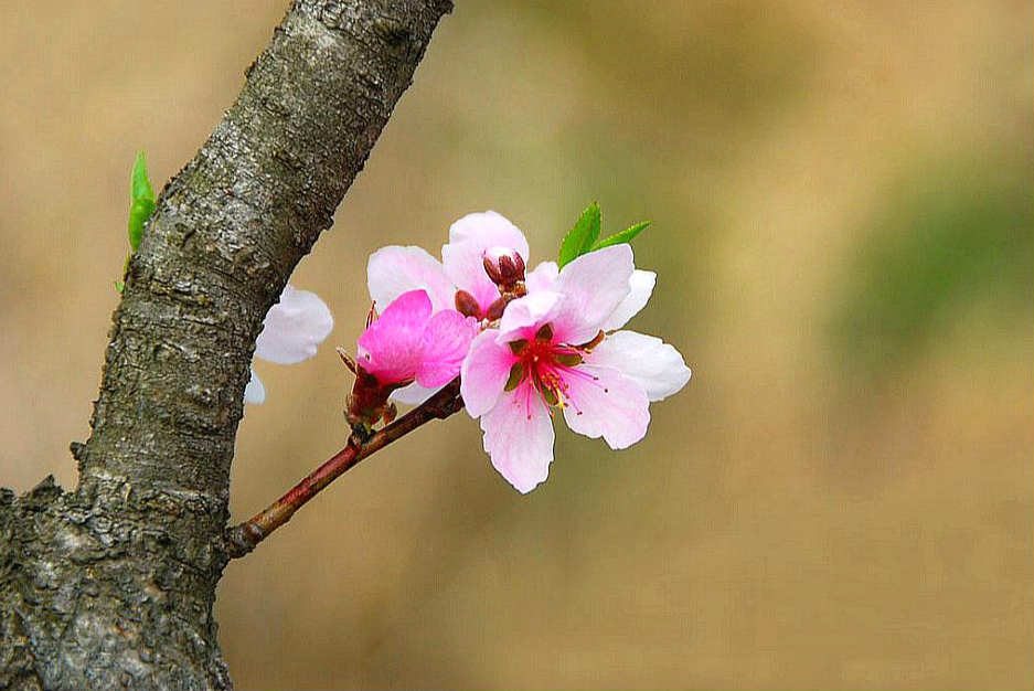 5월의 복사나무 꽃으로 잎보다 먼저 분홍색으로