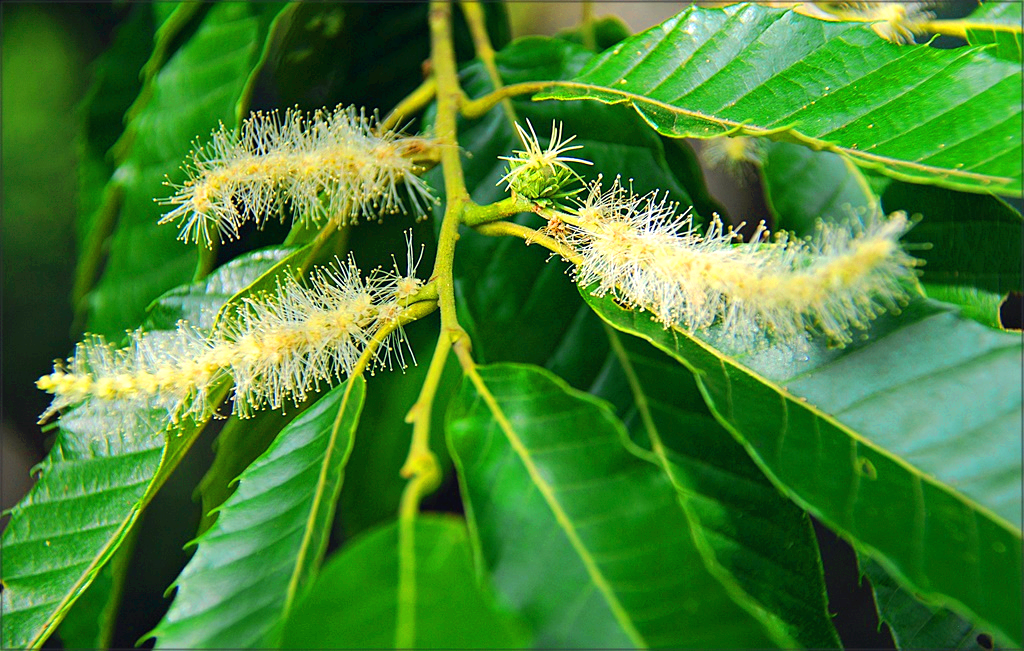 밤나무 7월 초의 꼬리 모양의 긴 수꽃과 암꽃이다.