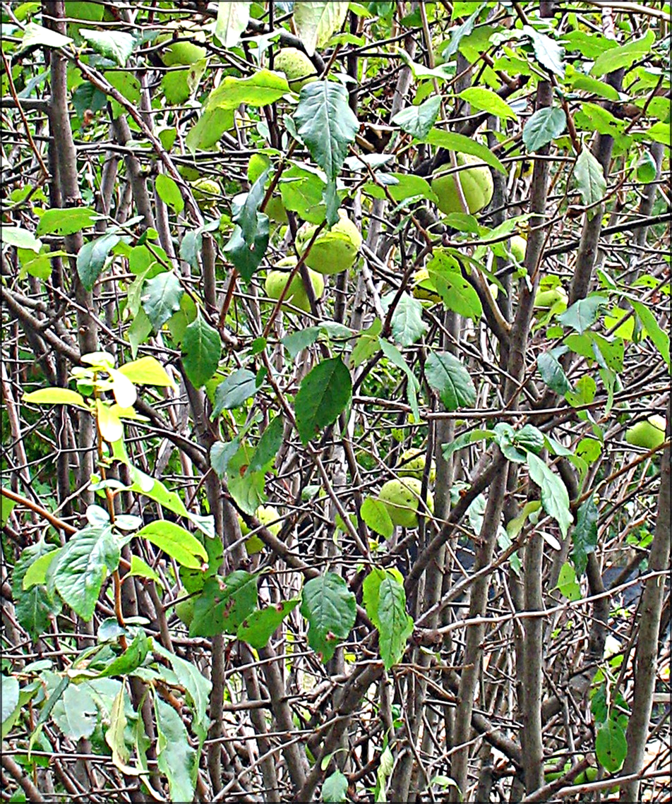 옆으로 퍼진다. 노란색으로 익은 명자꽃 열매는 모과를 닮았으며