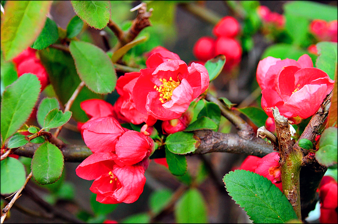 명자나무 잎의 가장자리는 날카롭고 규칙적인 톱니가 있다.