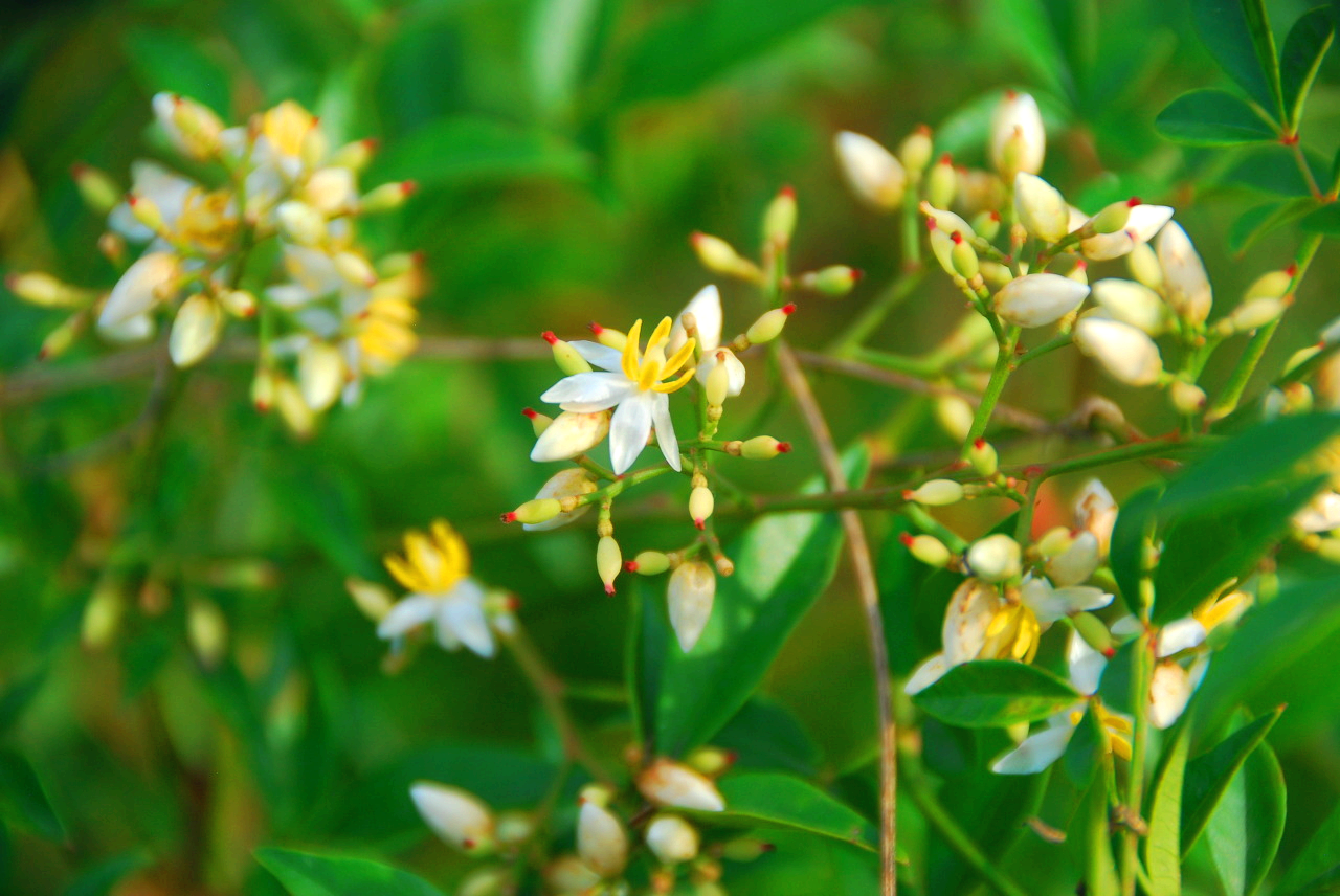 7월의 남천 꽃으로 6~7월에 줄기 끝의
