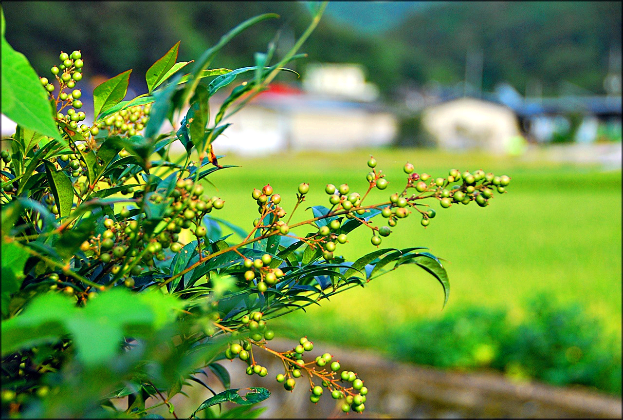 시골 좁은 도로변 관상수로 심은 남천, 환경이 좋은지