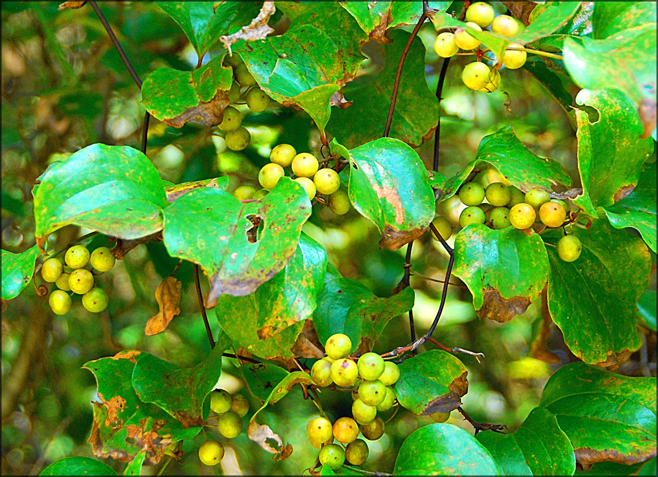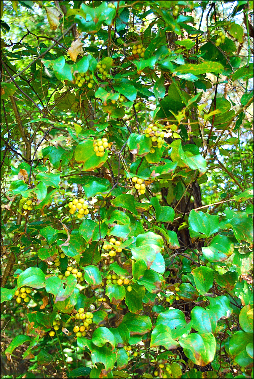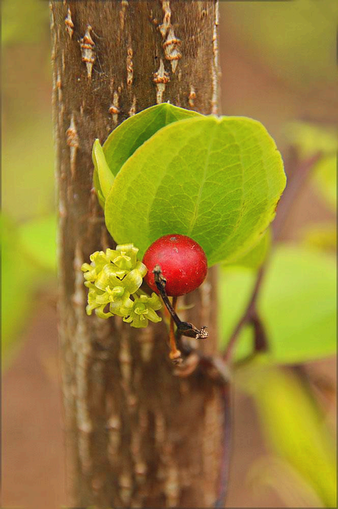 청미래덩굴 암꽃과 잎 묵은 열매다.
