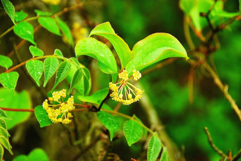 청미래덩굴 새로 나온 잎, 덩굴손과 함께 산형꽃차례에