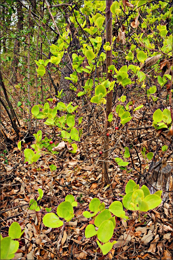 아래는 4월의 청미래덩굴 꽃과 잎, 그리고 붉은색으로