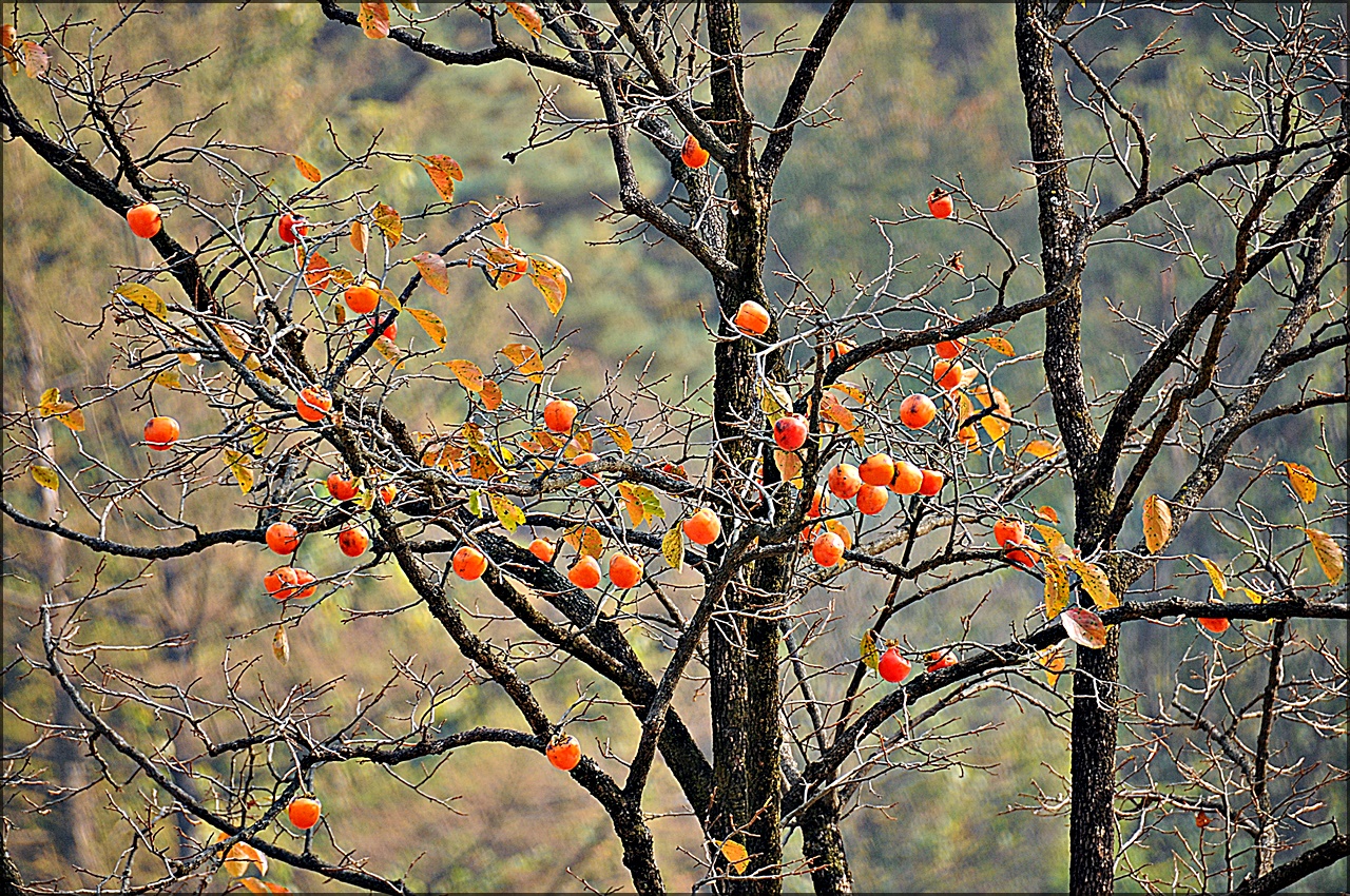 11월의 감나무로 잎은 다 떨어지고 감만 대롱대롱 매달려 있다.