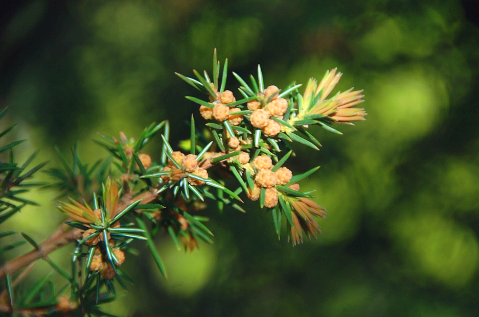5월의 노간주나무 수꽃으로 암수딴그루인데 꽃은