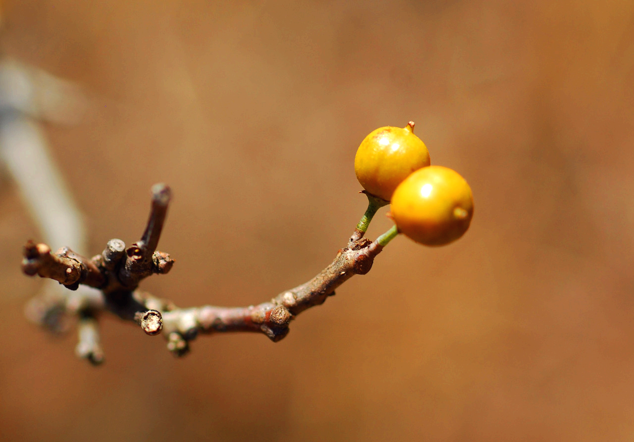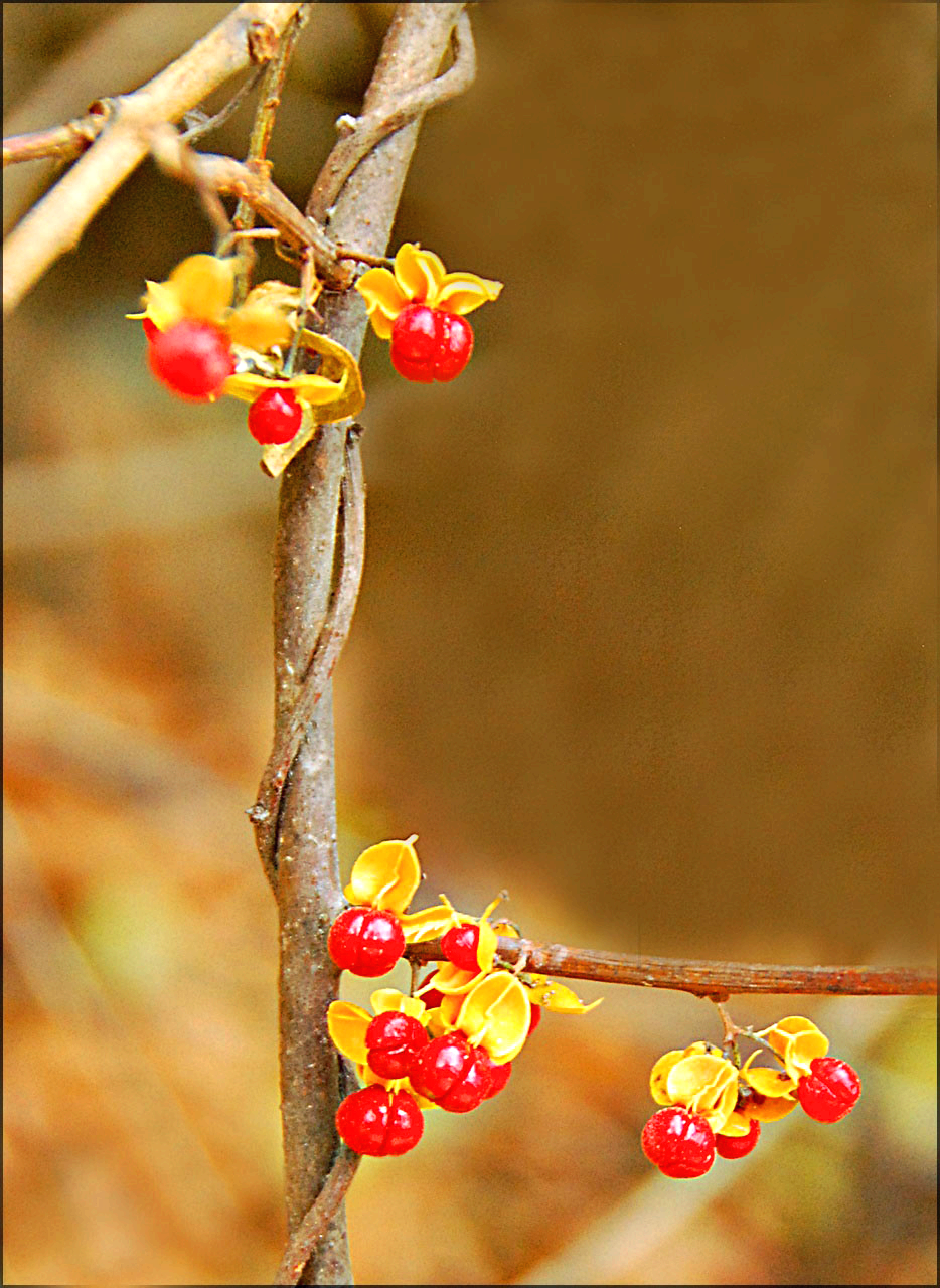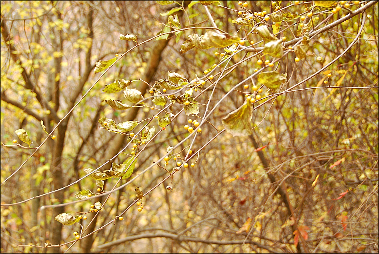 노박덩굴로 둥근 열매가 노란색으로 익으면 3갈래로 갈라지면서