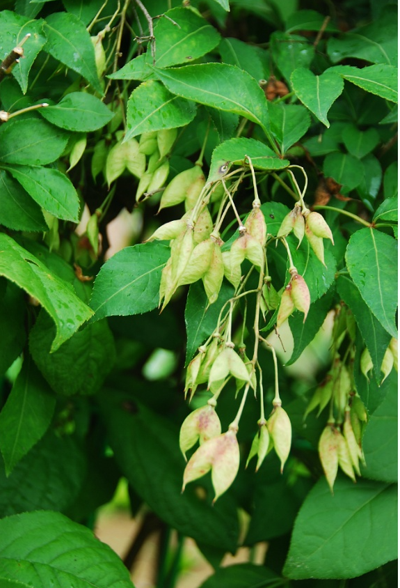 6월의 고추나무 열매로 부푼 반 원형 열매는 윗부분이 2개로