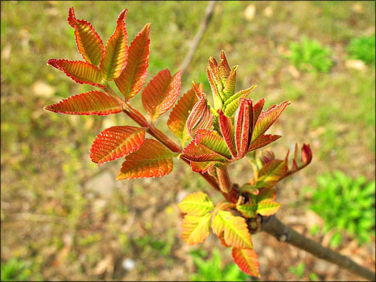봄의 새로 나온 붉나무 잎으로 잎자루 양쪽으로