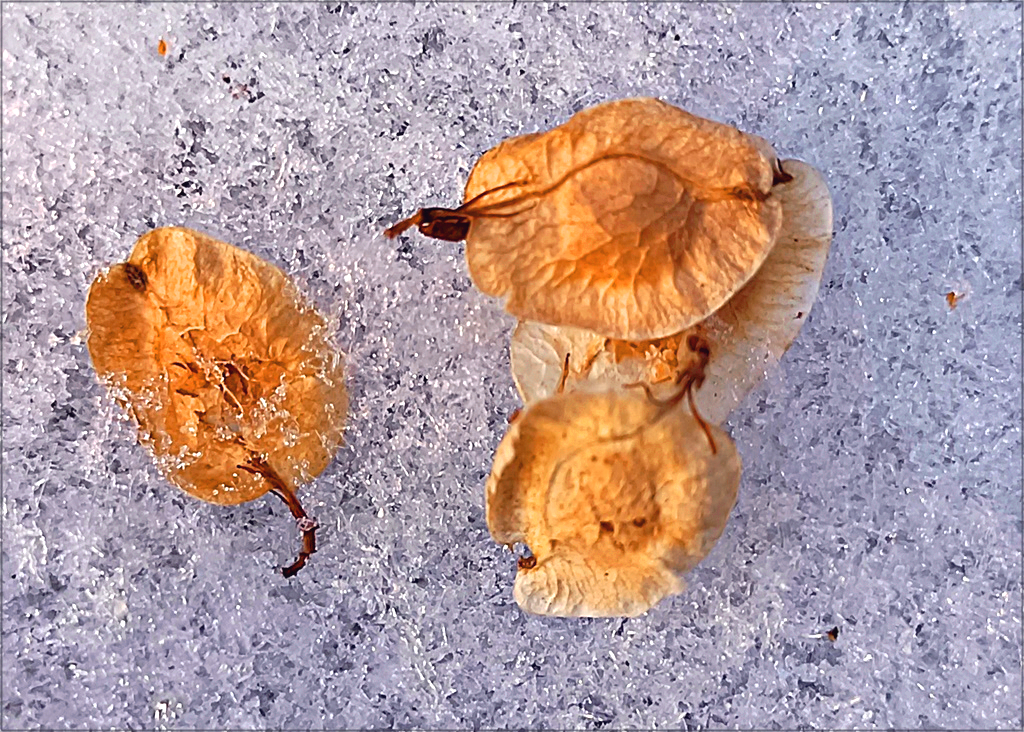 빙판 위에 떨어진 참느릅나무 열매다. 타원형