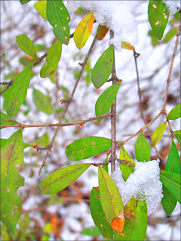 늦게까지 남아 있는 나무는 눈을 뒤집어쓰고 있다.