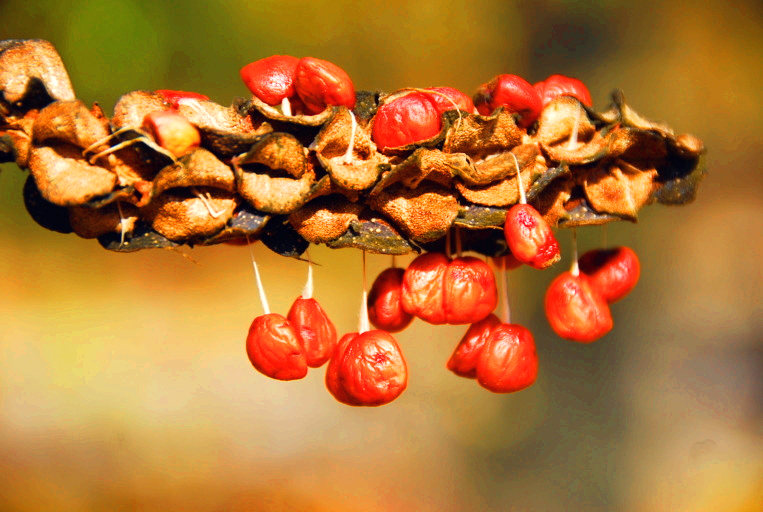 익으면 칸칸이 벌어지면서 주홍색 씨가 드러난다.