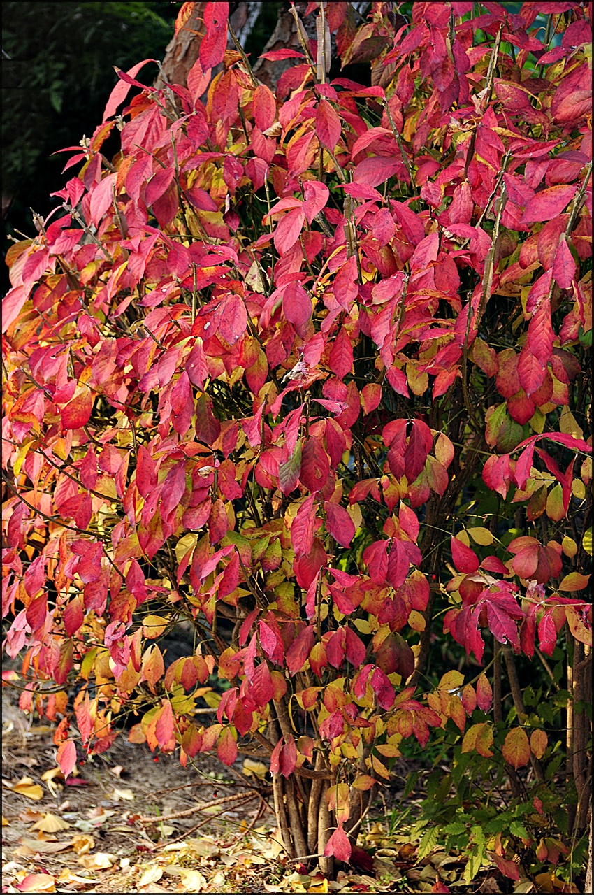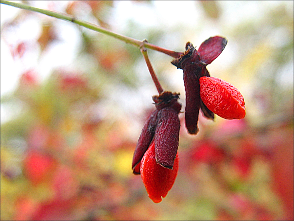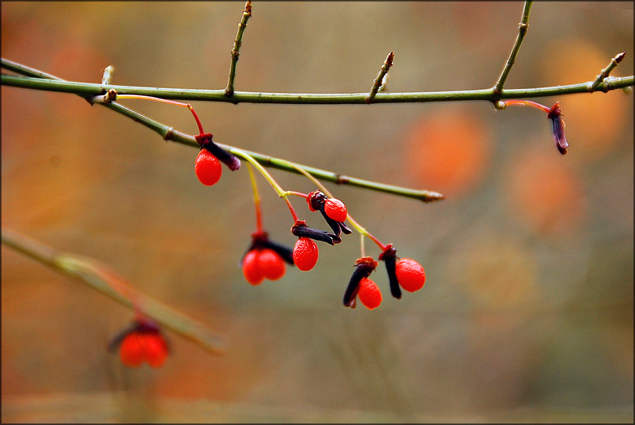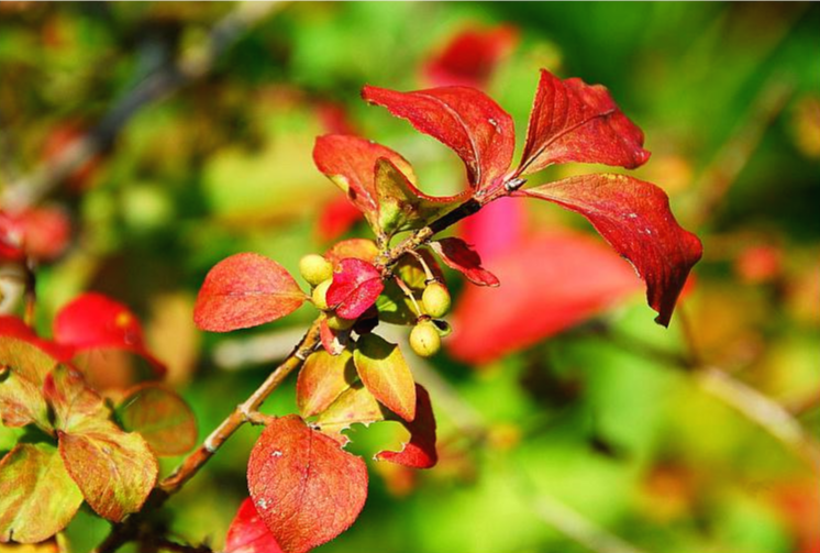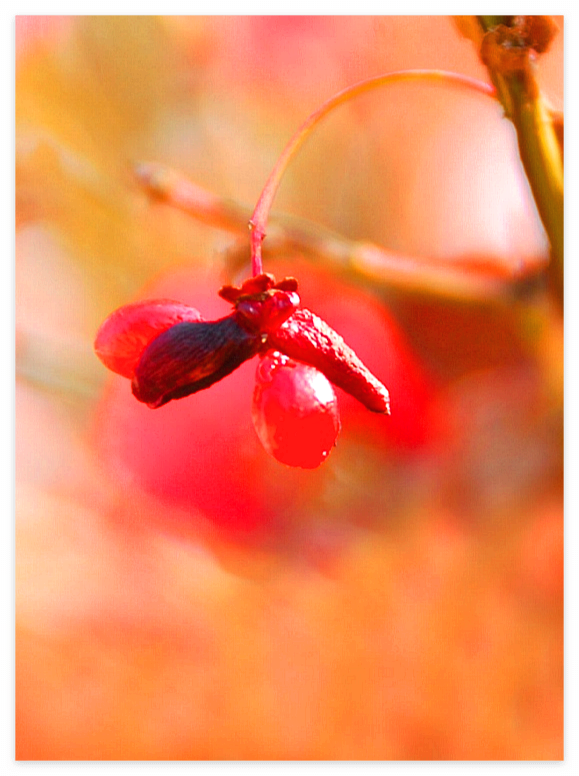 화살나무 열매로 껍질이 벌어지면서 주홍색 씨가 드러난다.