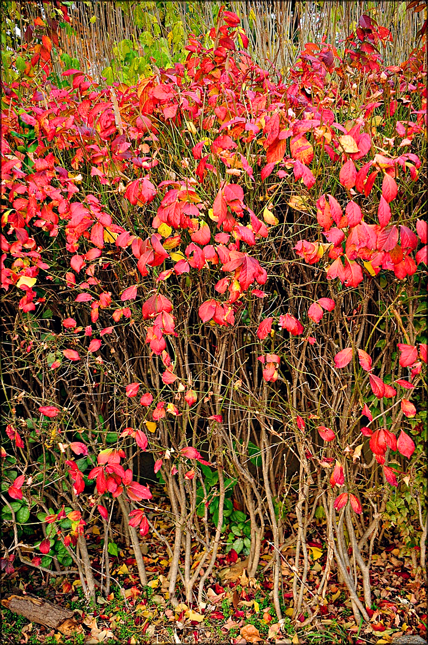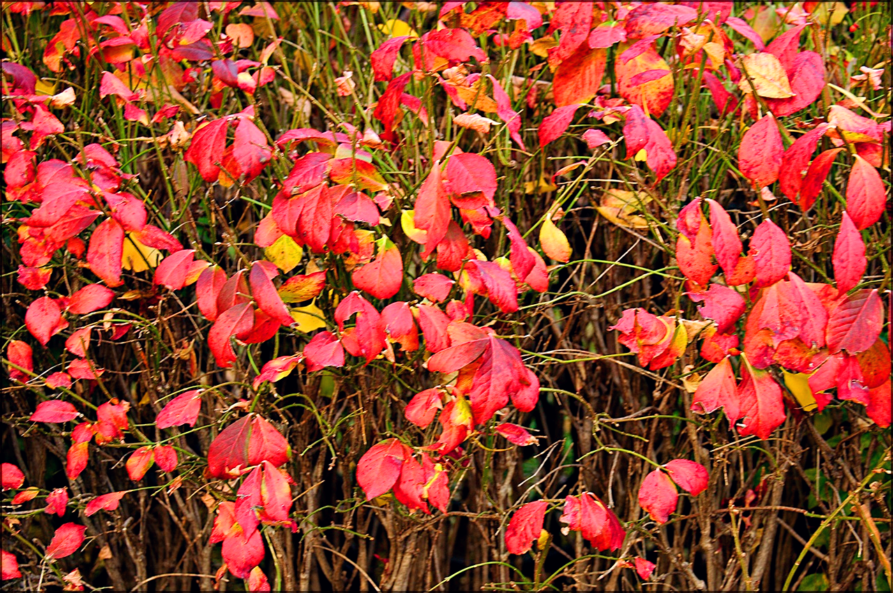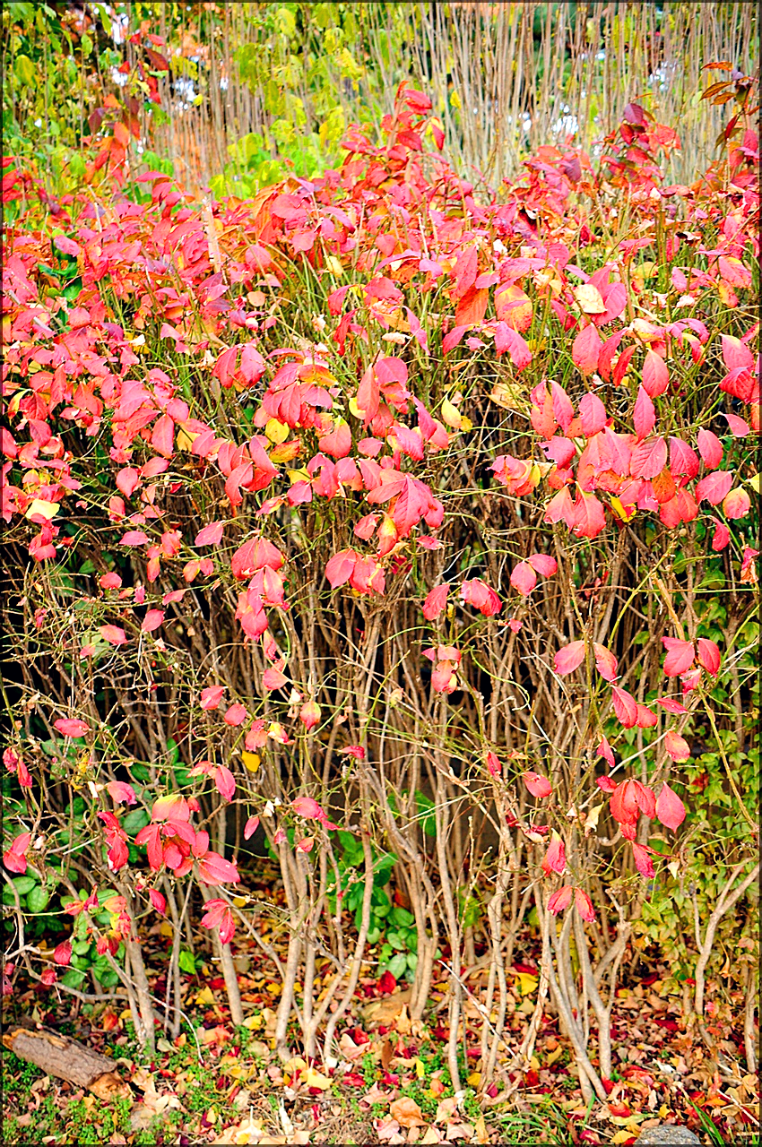 화살나무 열매로 껍질이 벌어지면서 주홍색 씨가 드러난다.