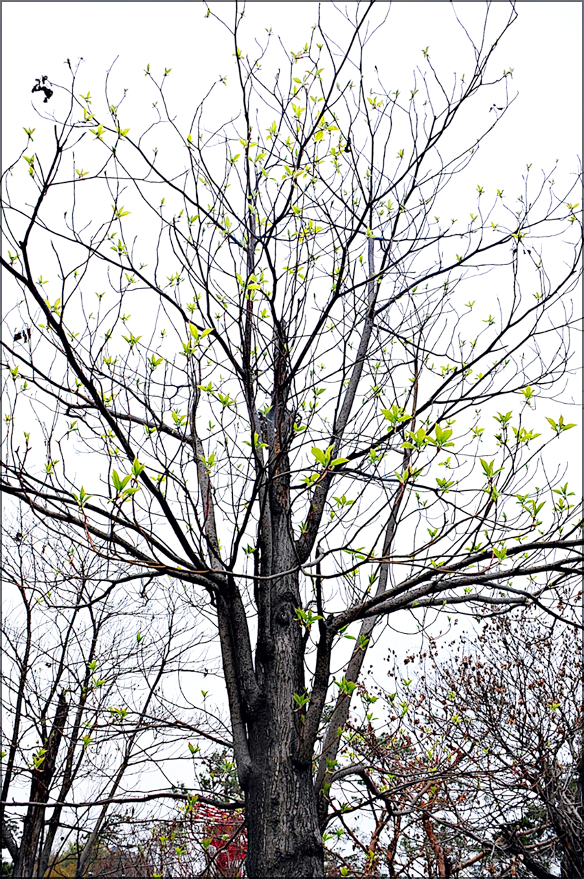 층층나무로 봄에 나는 새잎으로 넓은 타원형 잎은 끝이 뾰족하고