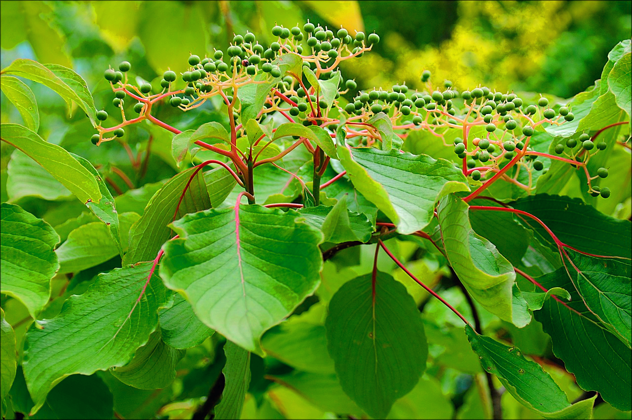 층층나무 열매로 익기 전 모습으로 콩처럼 둥글며
