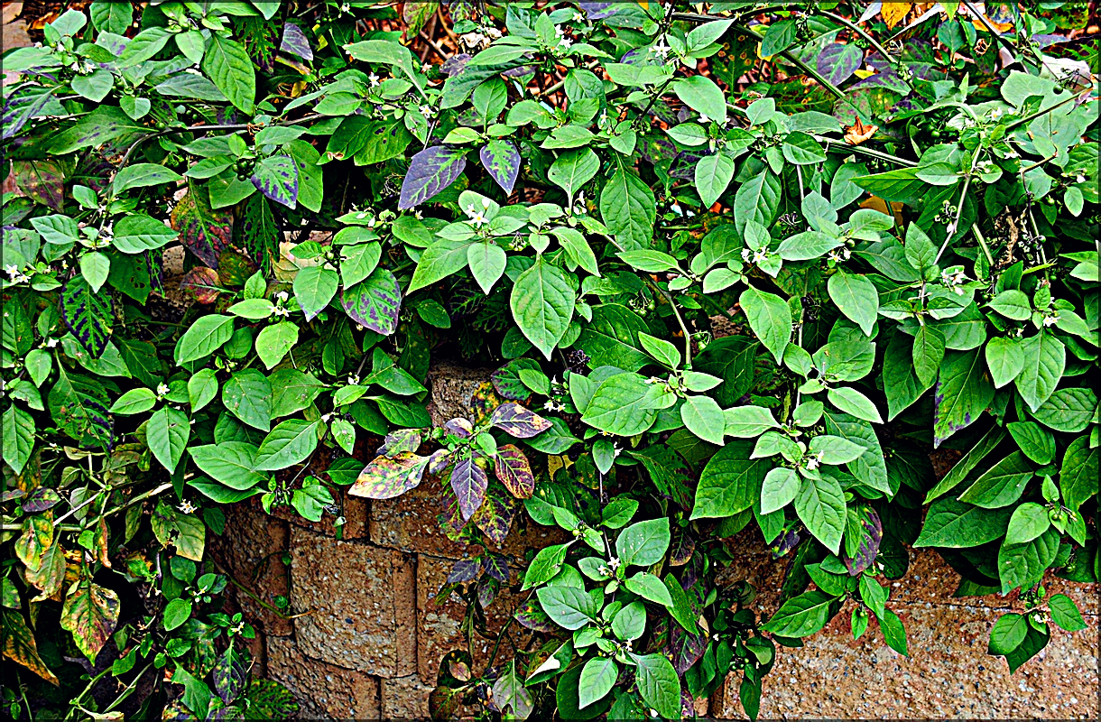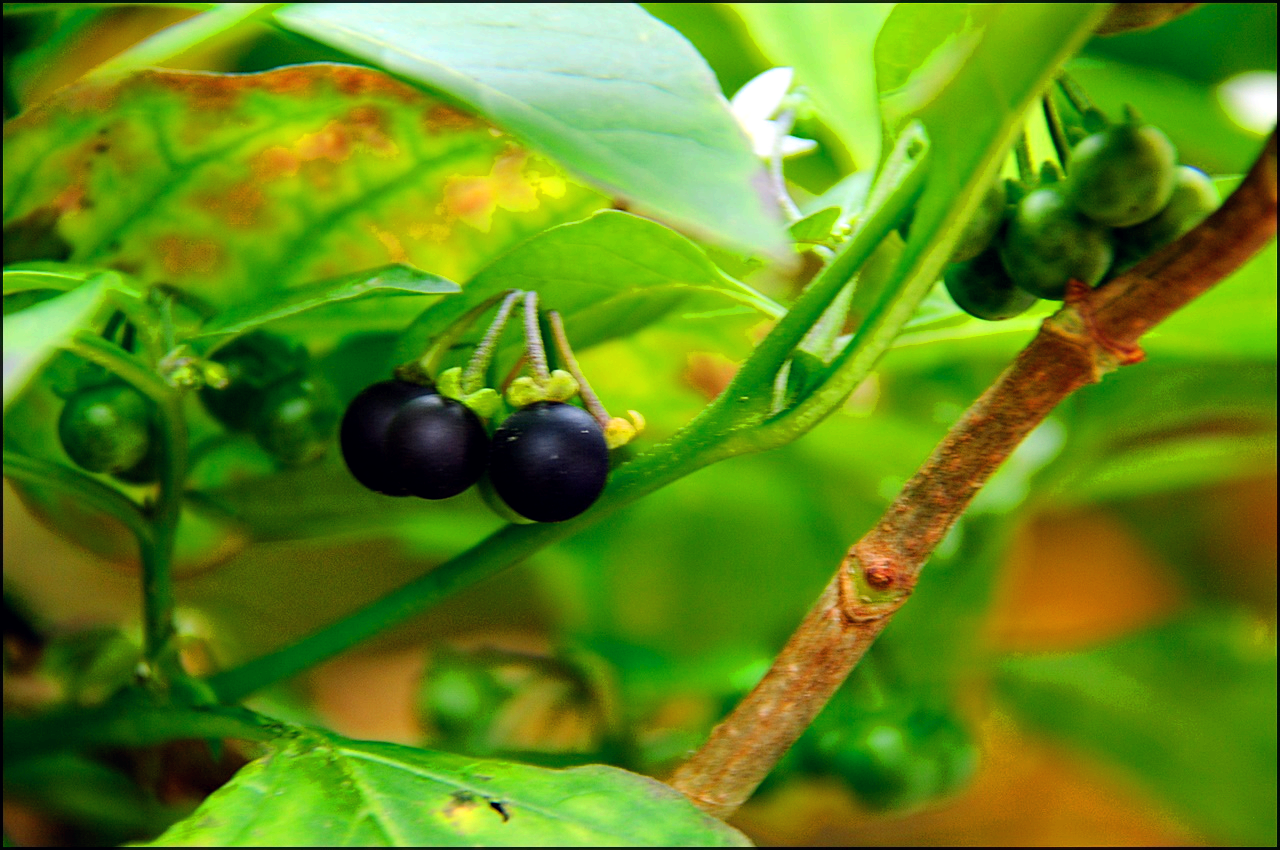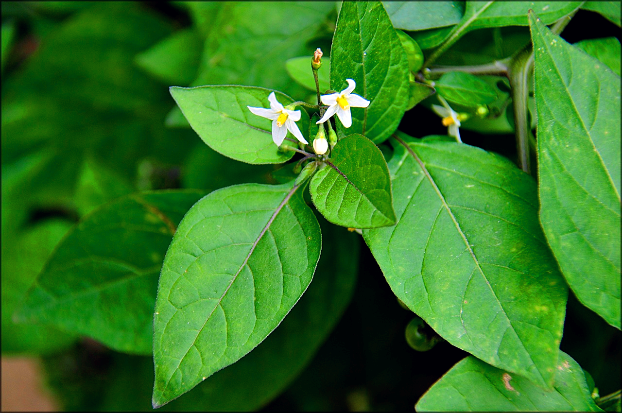 까마중으로 꽃과 함께 익지 않은 열매와 익은 열매가 함께