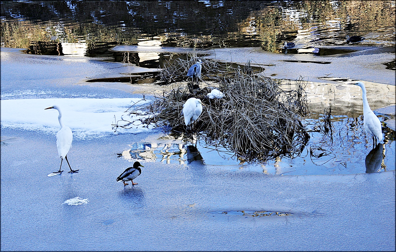 오랜만에 하천에 왜가리, 청둥오리, 중대백로가 사이좋게 지내는가 싶지만,