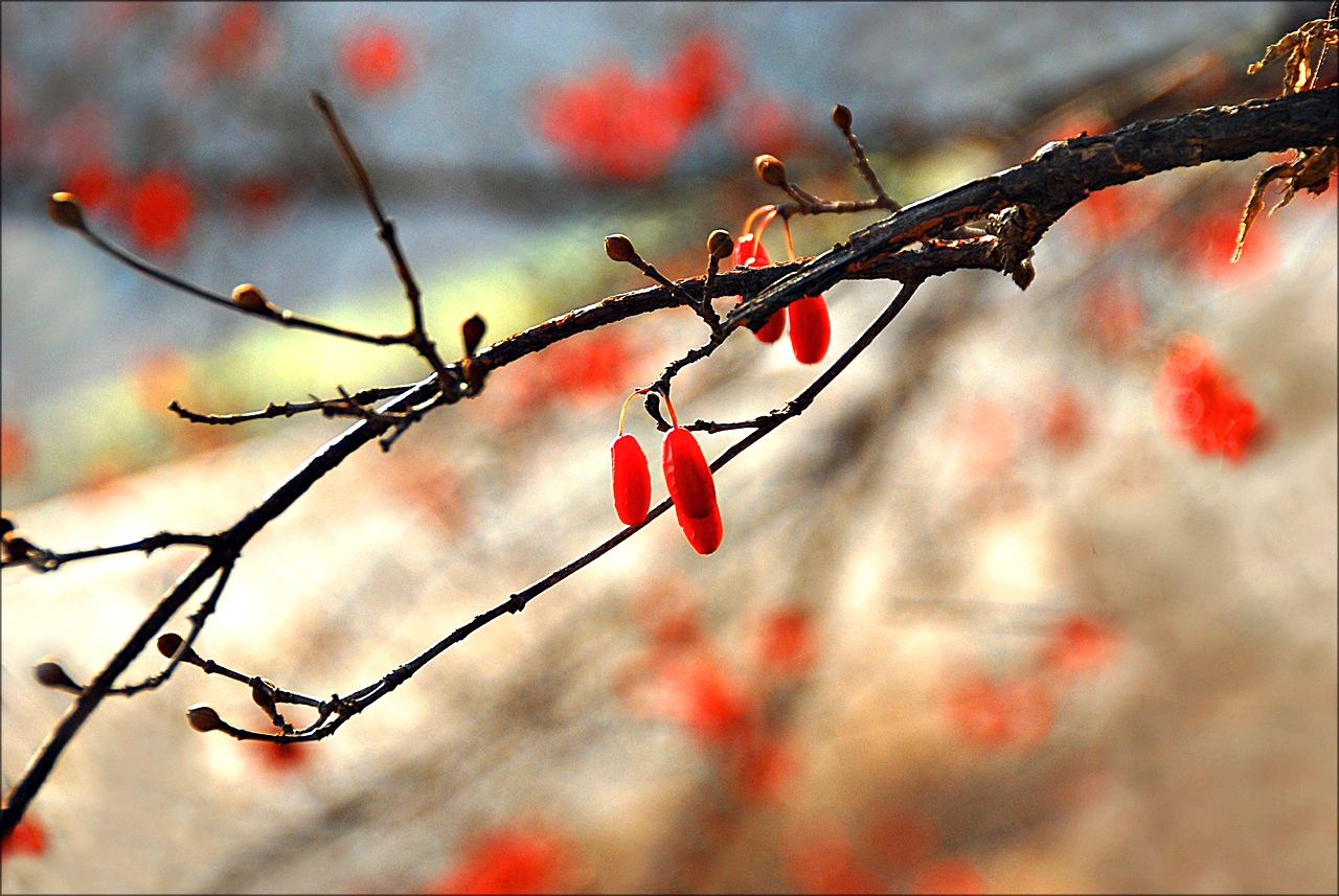 붉은색으로 잘 익은 탐스럽게 달린 산수유 열매