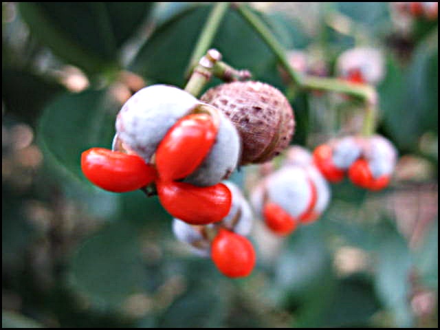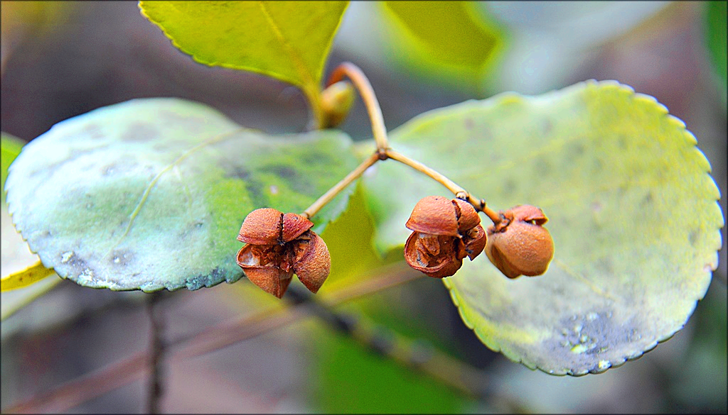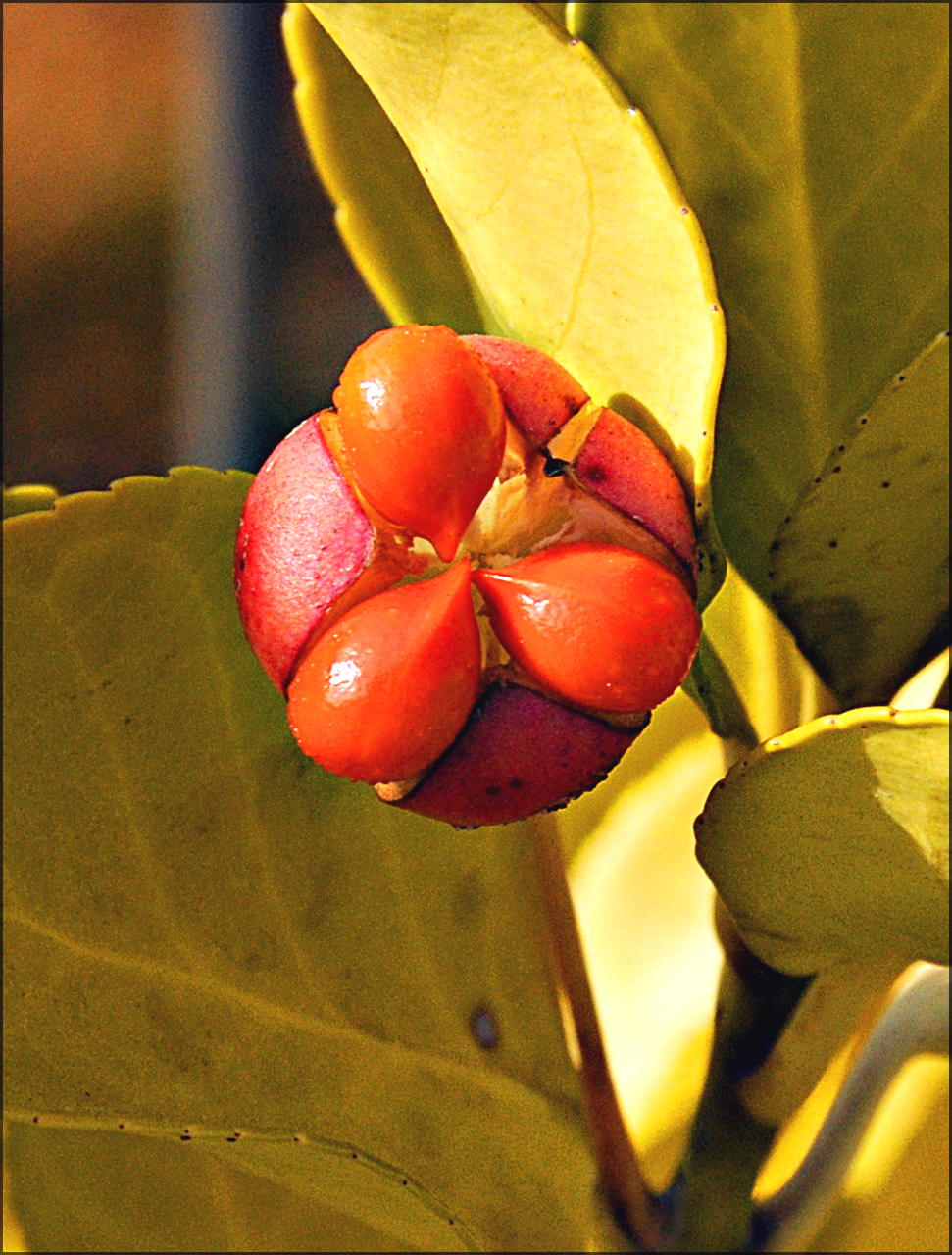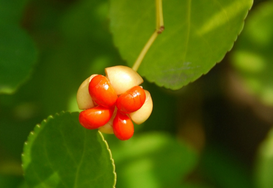 주황색으로 익은 열매는 껍질이 벌어지면서 네 개로 갈라지면서