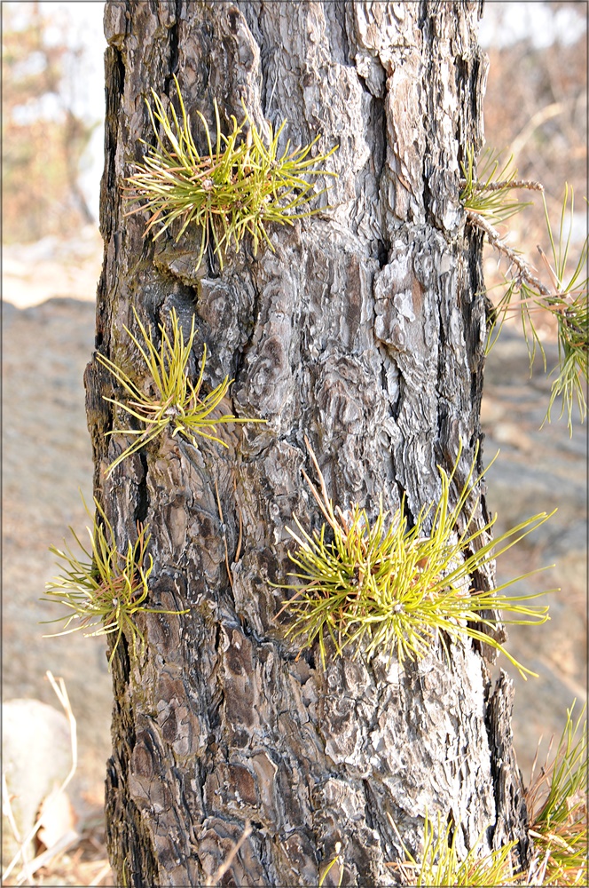 구분이 된다. 수피도 소나무와는 달리 줄기에도 짧은 가지가 나와