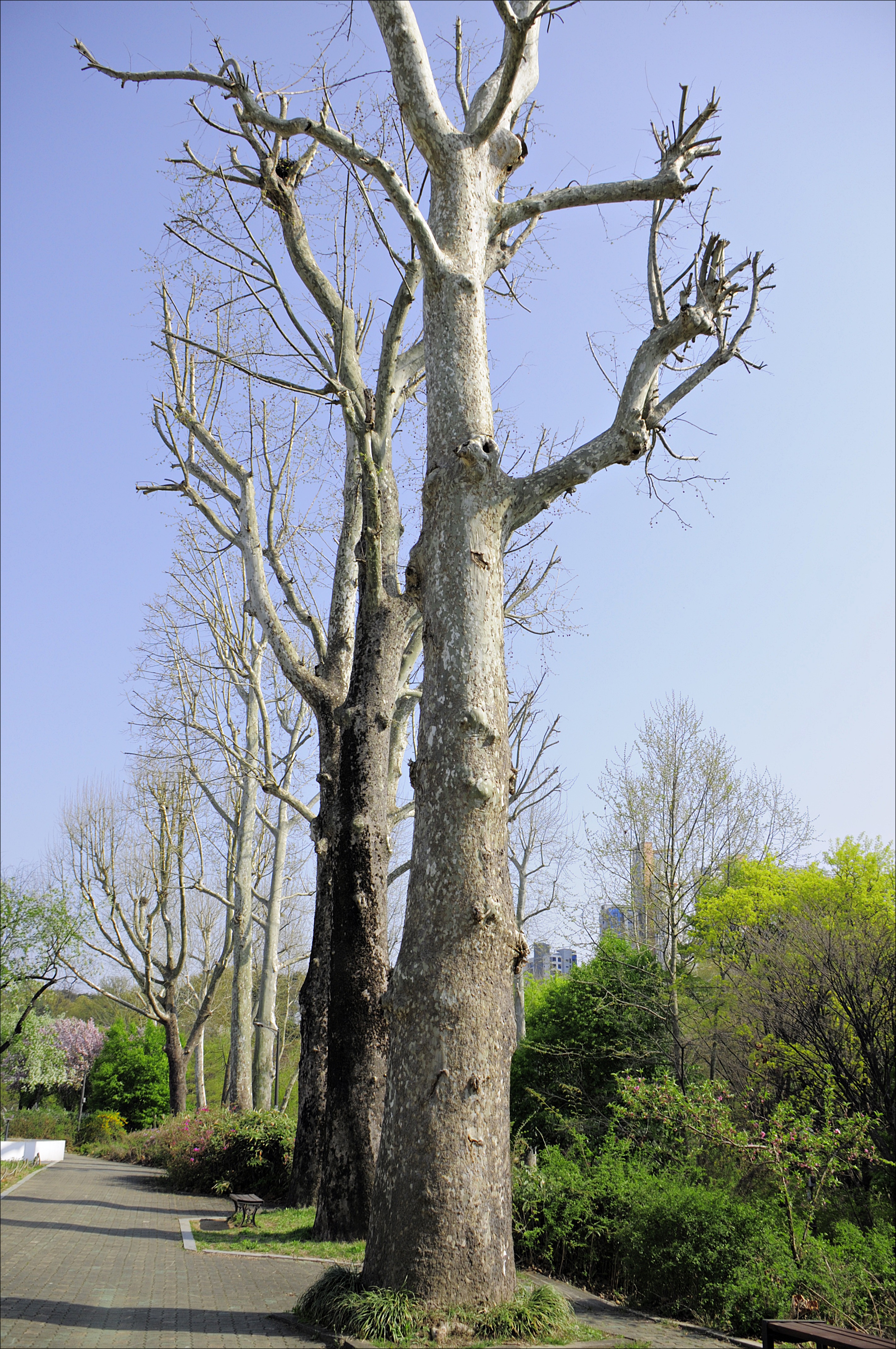 양버즘나무로 좌측의 우측 높은 곳에 위의 까치집이 작게 보인다.