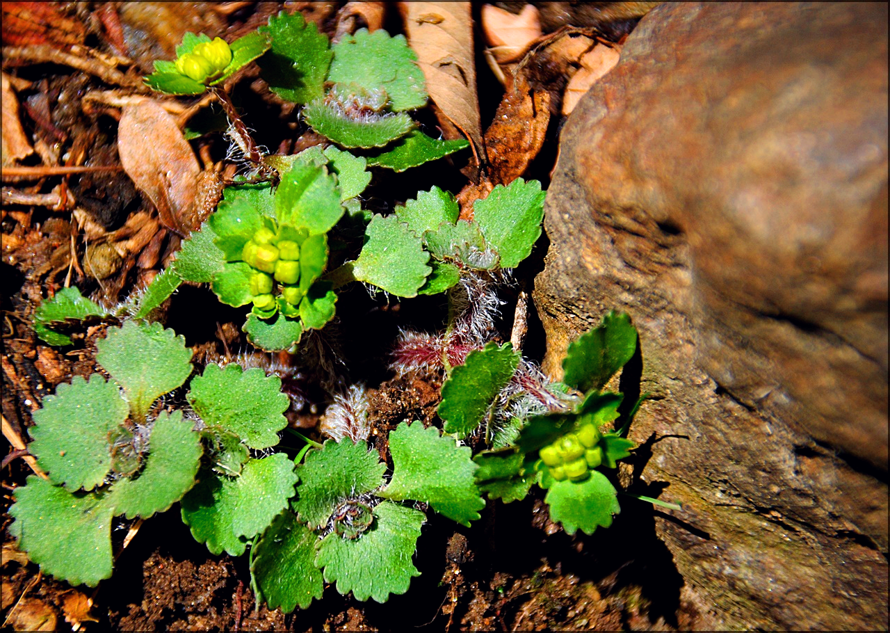아직 꽃을 피우지 않은 흰털괭이눈이다.