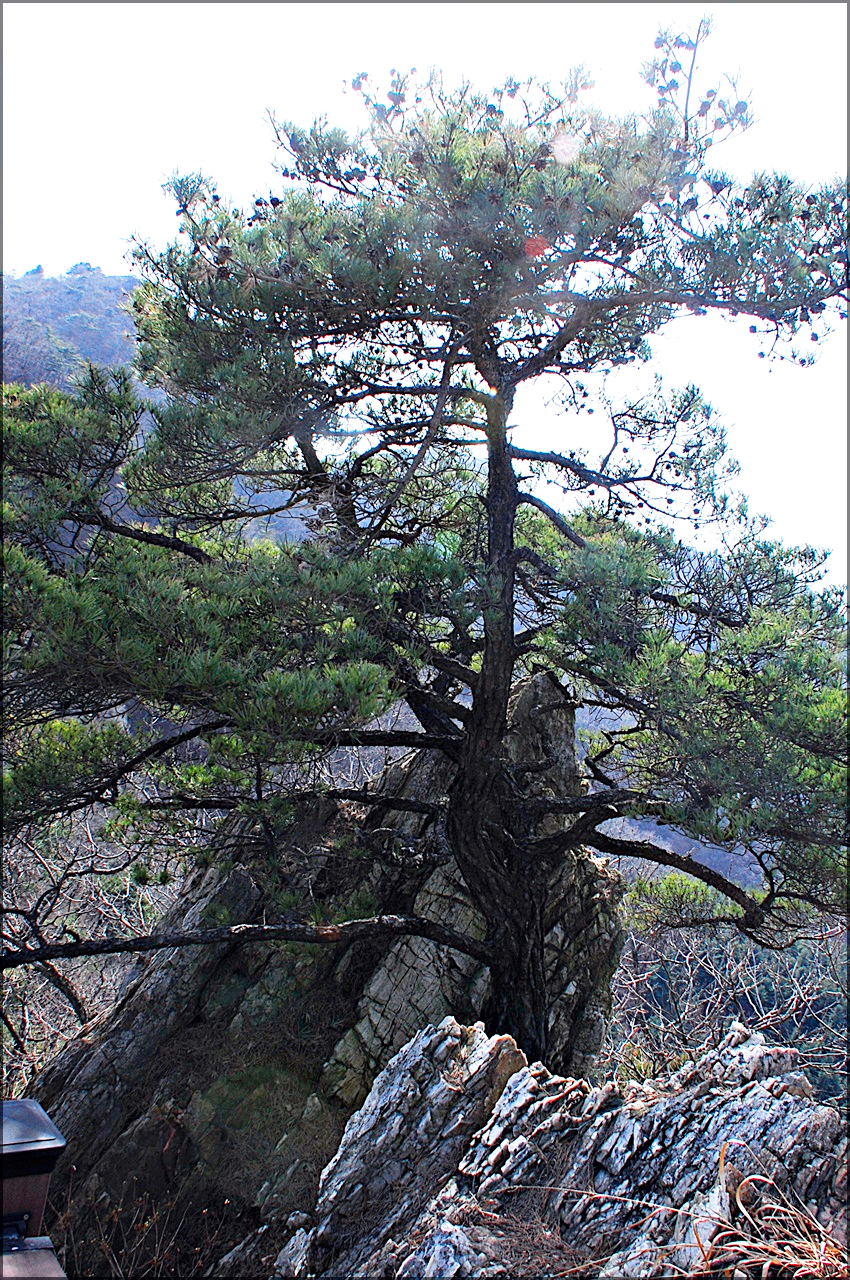 소나무 가지가 땅 위로 휘어져서 자라고 있다.