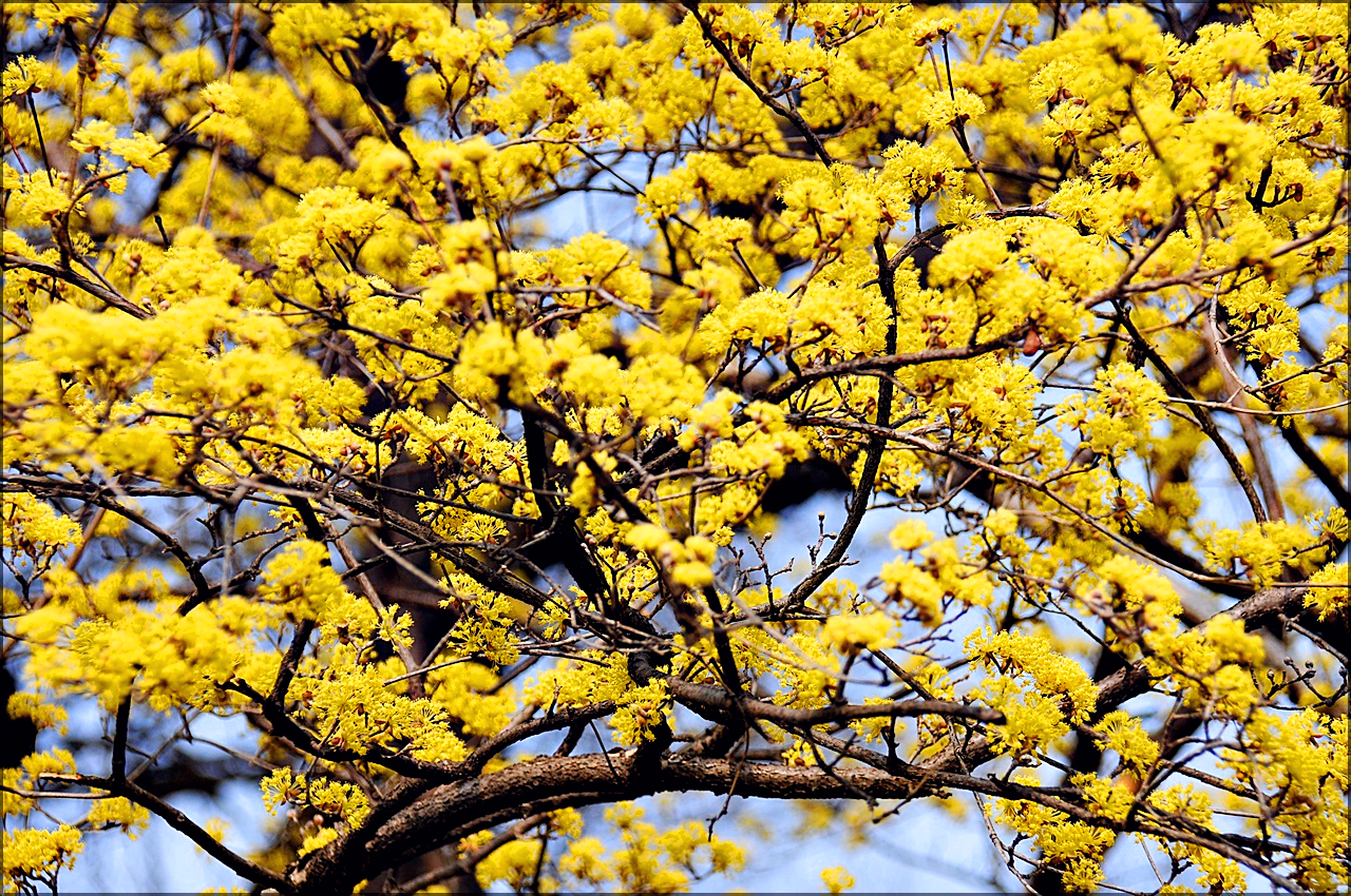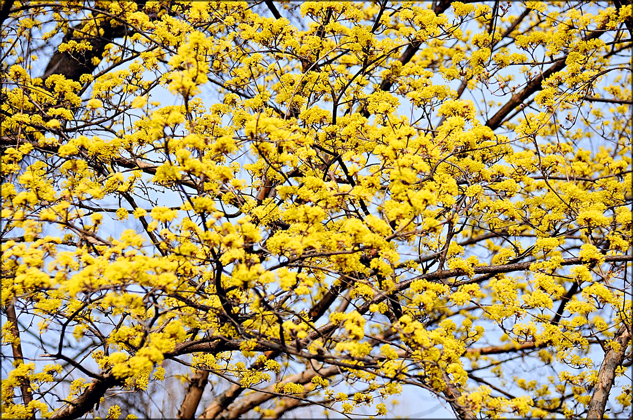 꽃은 잎보다 먼저 피는데 짧은 가지 끝의 산형꽃차례에 노란색 꽃이