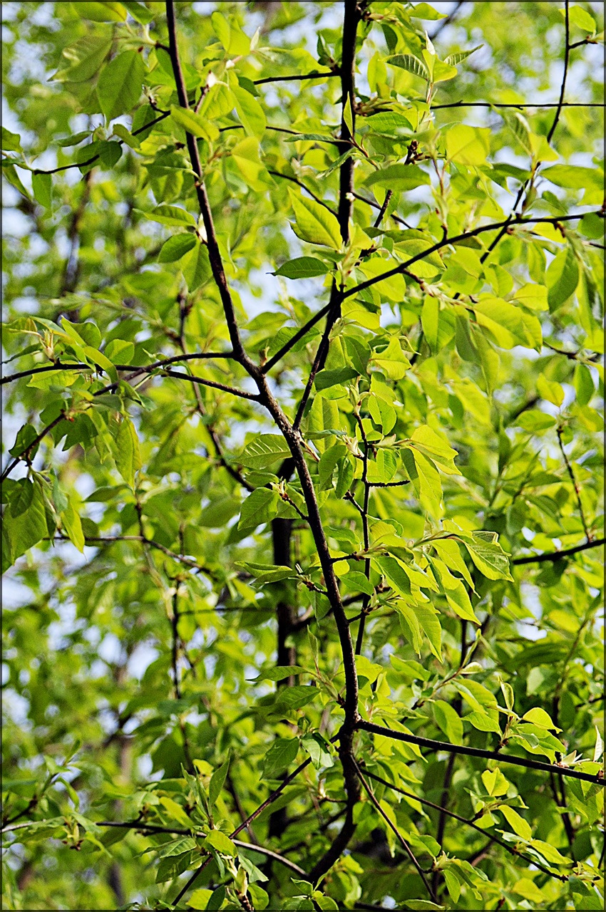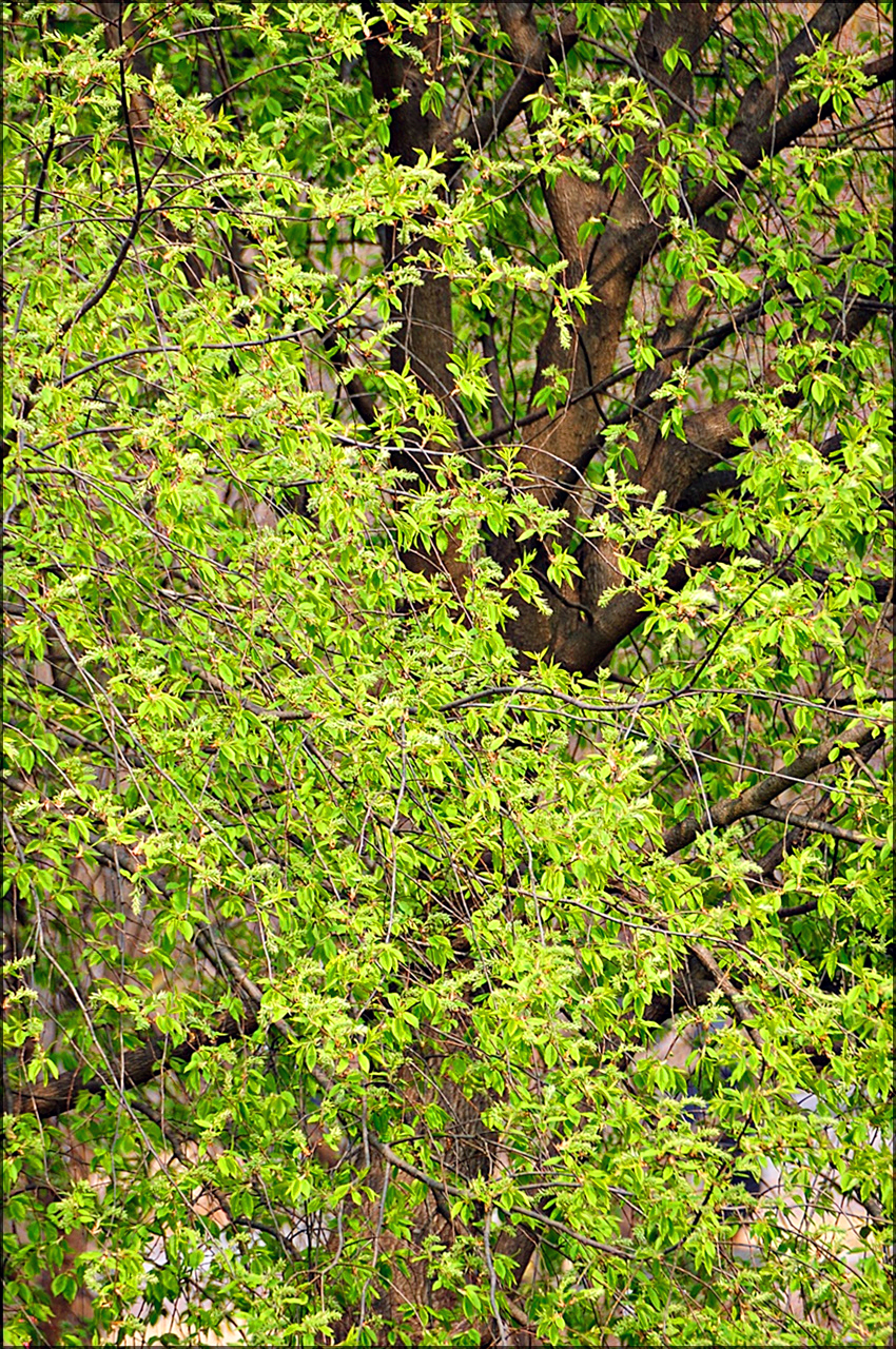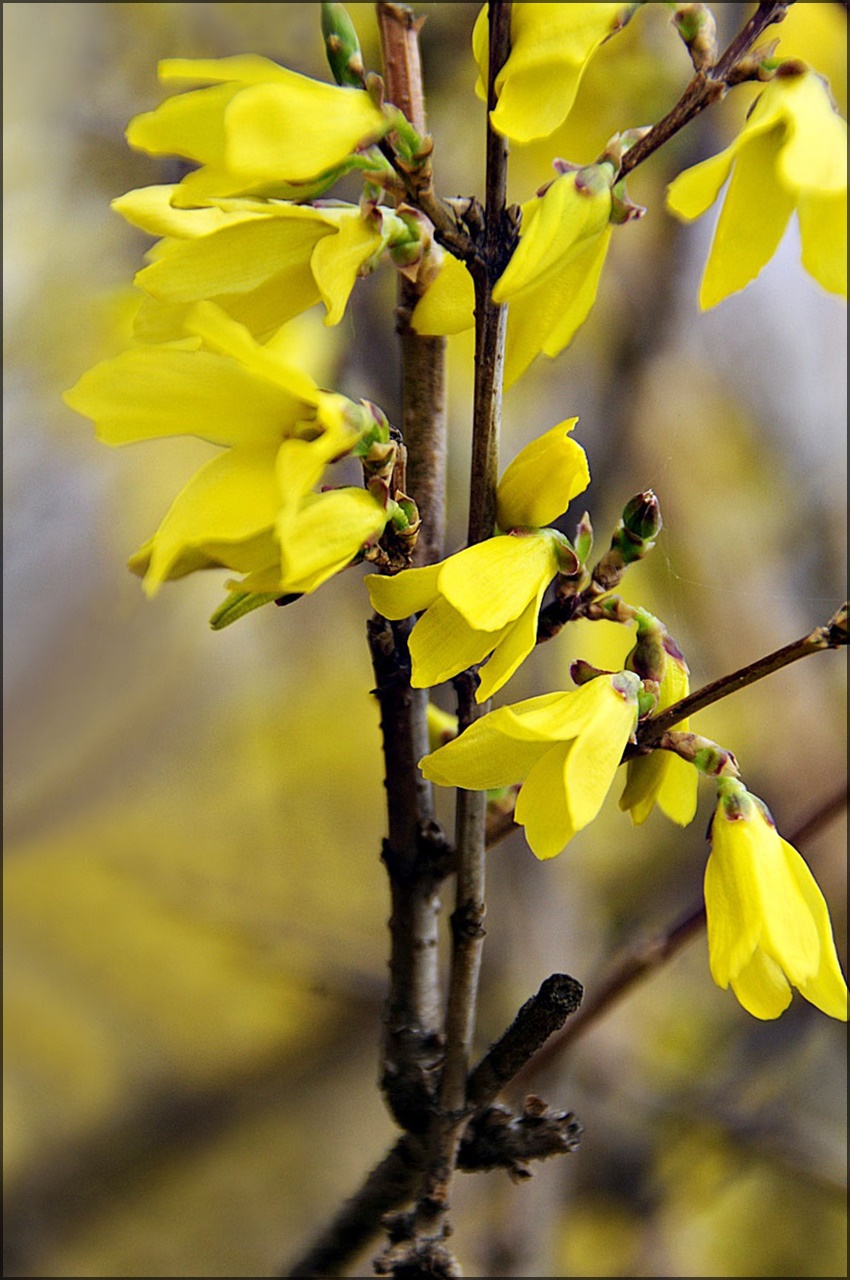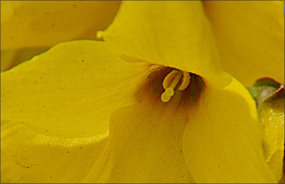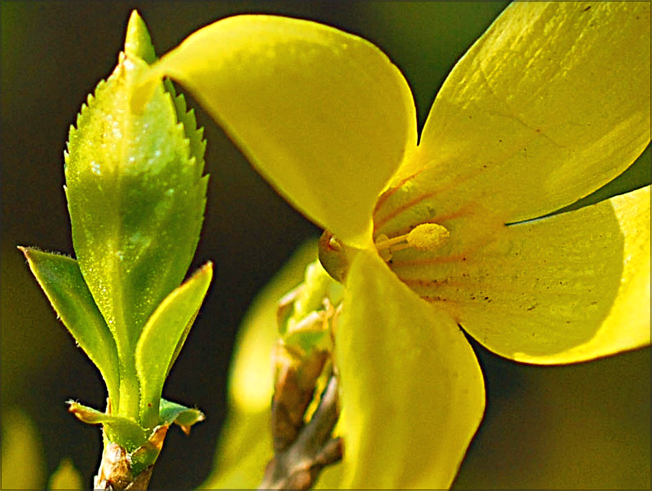 개나리 암꽃의 암술로 두 갈래로 갈라진 모습이다. 수술은 2개로