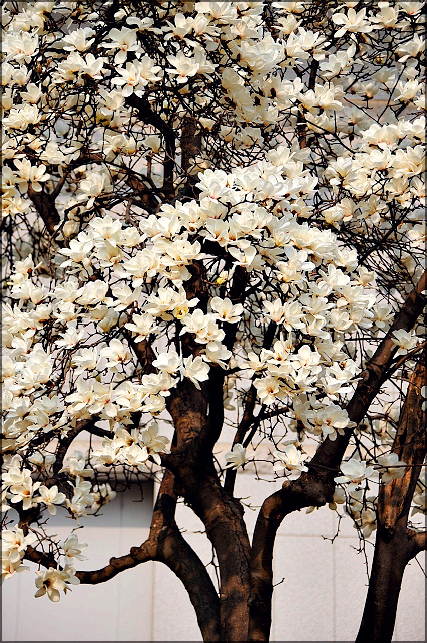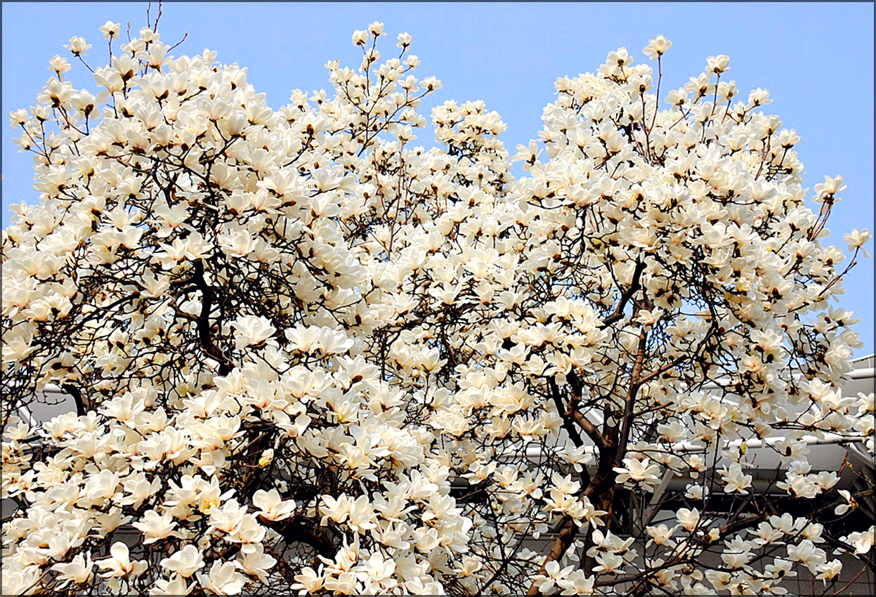 건물 앞 목련이 다른 곳과는 달리 활짝 꽃을 피우고 있다.