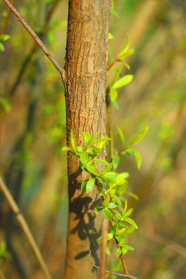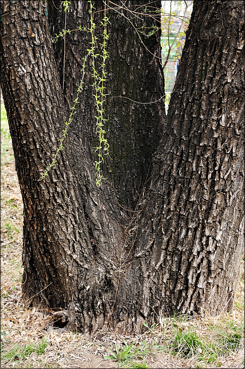 능수버들 수피로 회갈색이며 세로로 갈라진다.