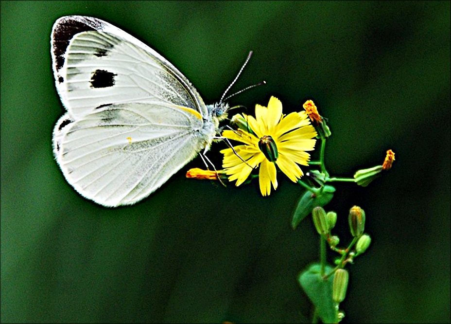이고들빼기 꽃을 찾은 대만흰나비 암컷으로 수컷보다 윗면의
