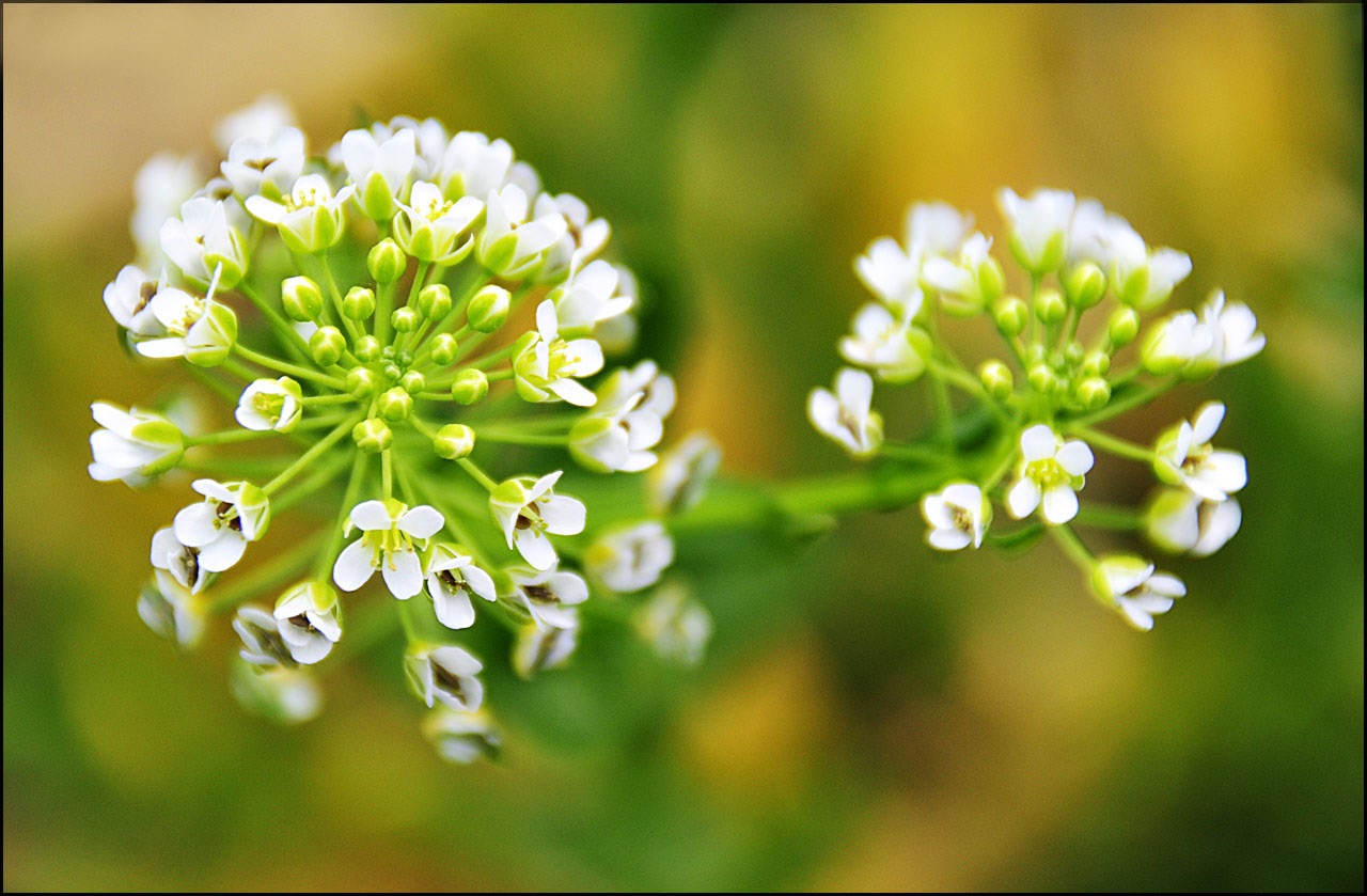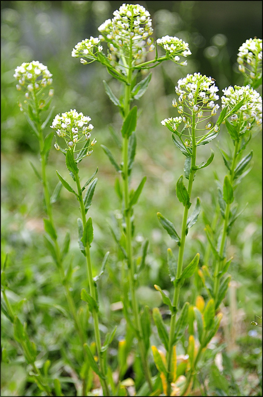 총상꽃차례에 십자 모양의 흰색 꽃이 촘촘히 달린다.